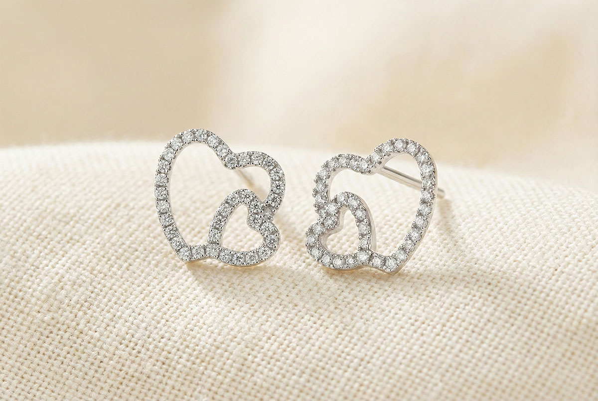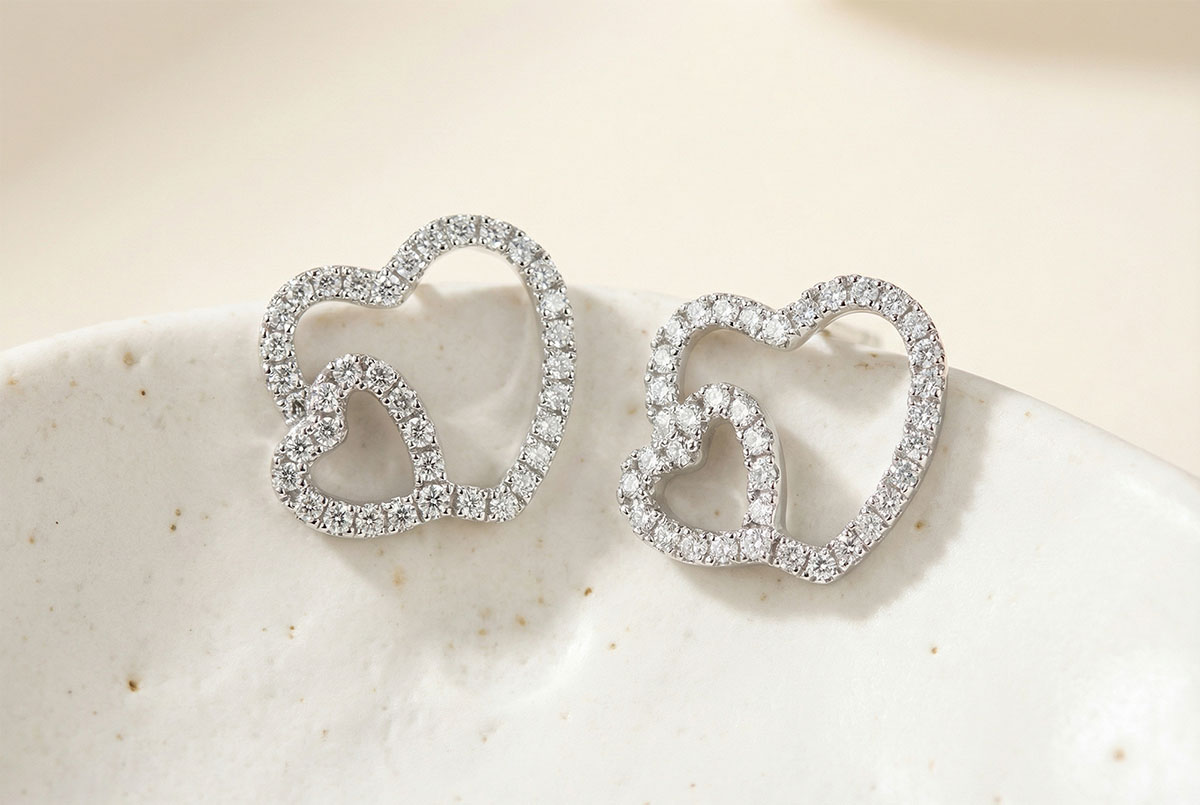 Das typische Herzmotiv in einer Duo-Version bildet raffinierte und zarte Ohrringe mit Diamantpaves.