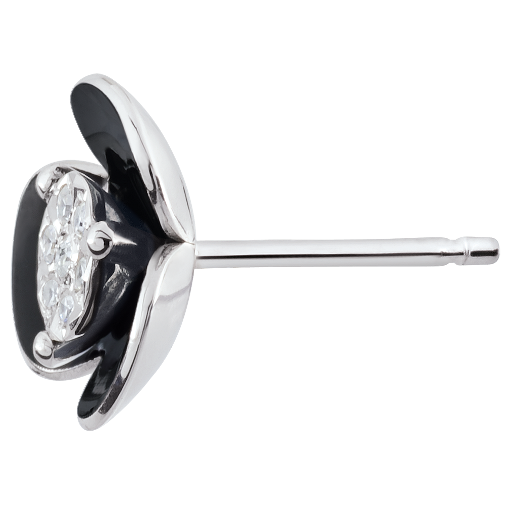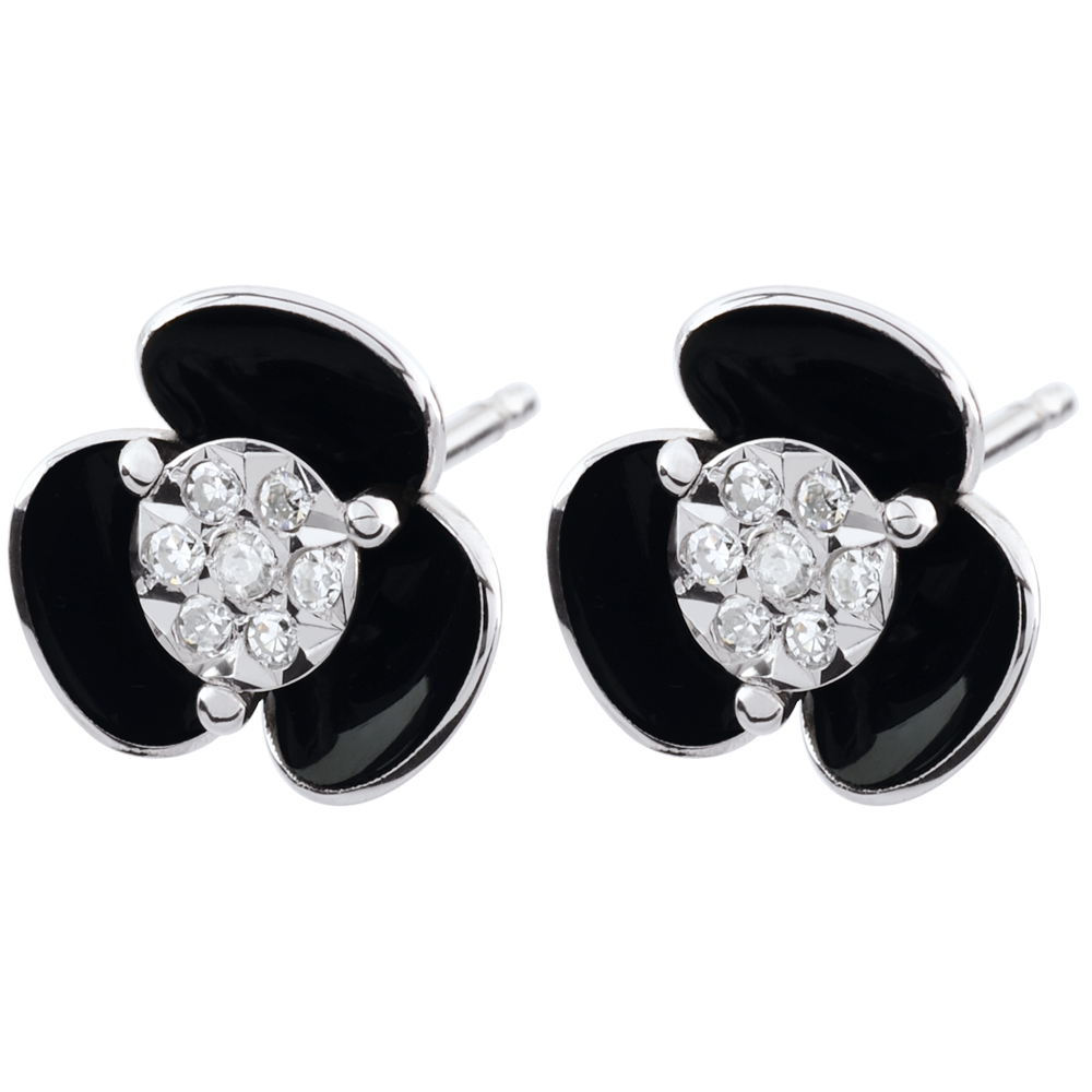 Ein erlesenes Blumenduo mit jeweils drei schwarzen Blütenblättern, welche im Inneren eine Myriade weißer Diamanten birgen. 14 Diamanten : 0.06 Karat - Weißgold (375/-): 1 g. Weitere Abmessungen