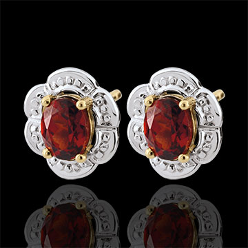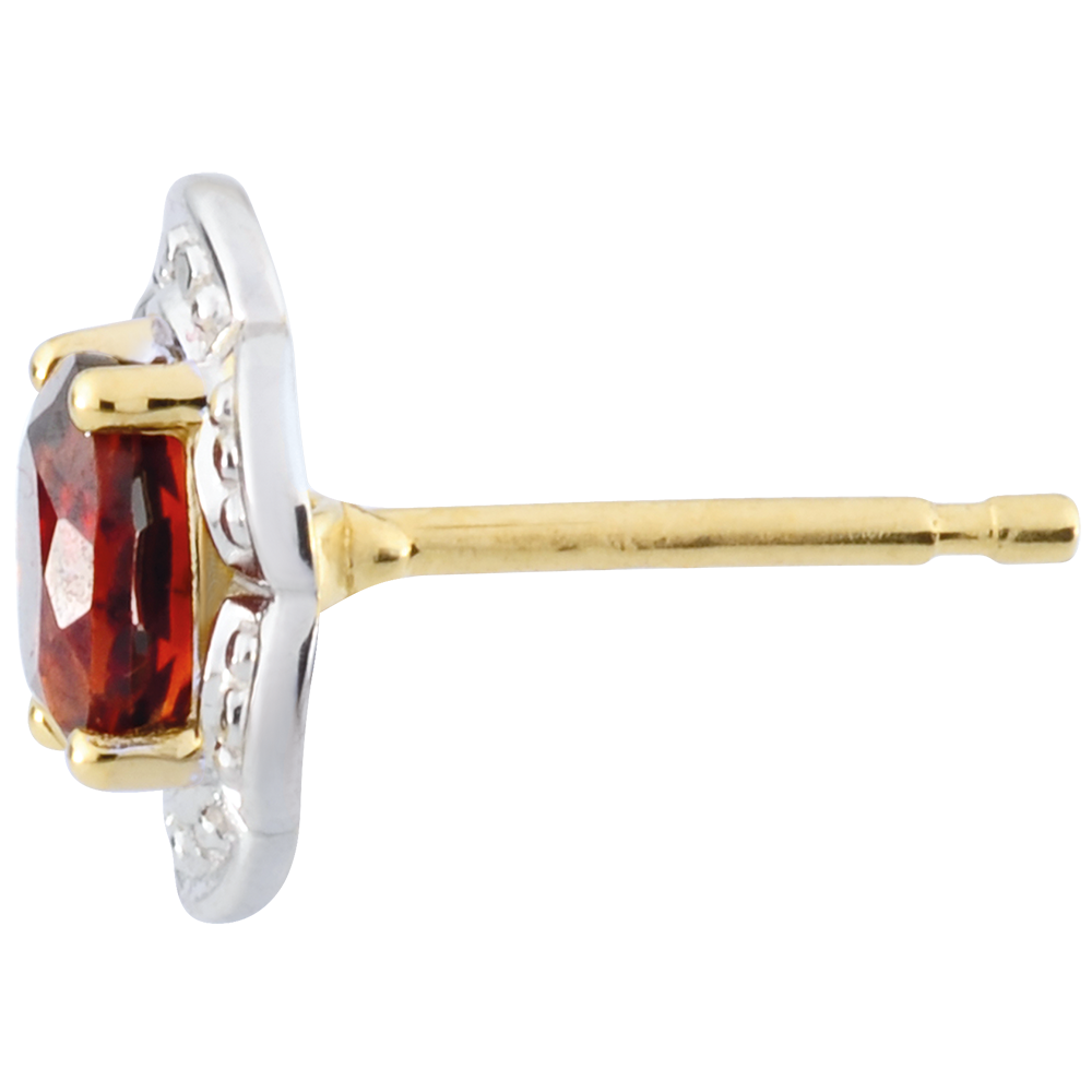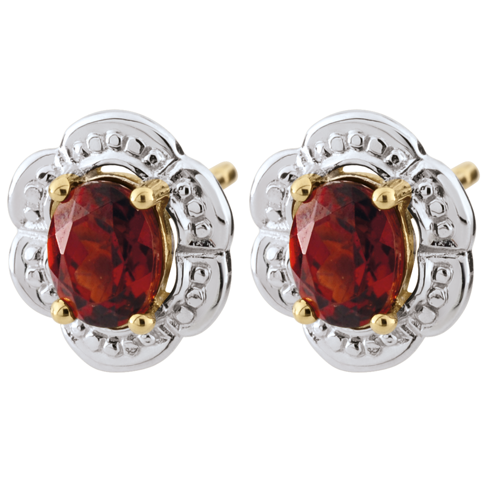 Ein Paar blumige Ohrstecker mit zwei tiefroten Granaten im Zentrum einer weißen Goldblütenkrone. Die Krappen und Stiele sind aus 9-karätigem Gelbgold gefertigt und schaffen einen eleganten Bicolor-Effekt. Das minimalistische Design verbindet Eleganz mit lebendiger Farbe für den Alltag.… Mehr sehen Technische Informationen