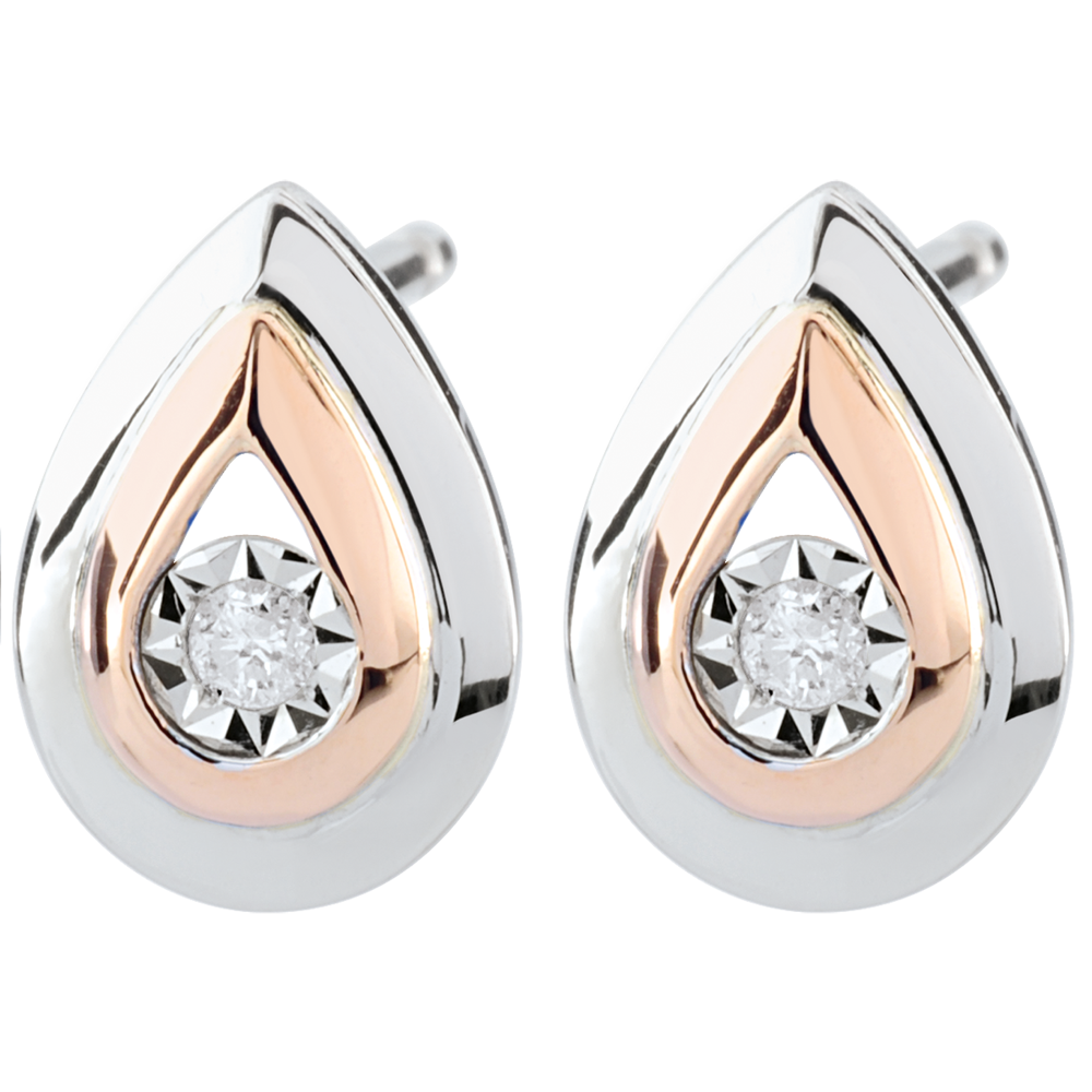 Zwei feine Tropfen aus Weißgold und Roségold, deren Zentrum ein schillernder Diamant bildet.