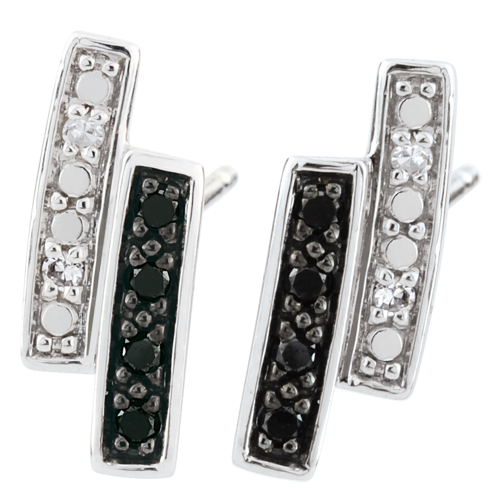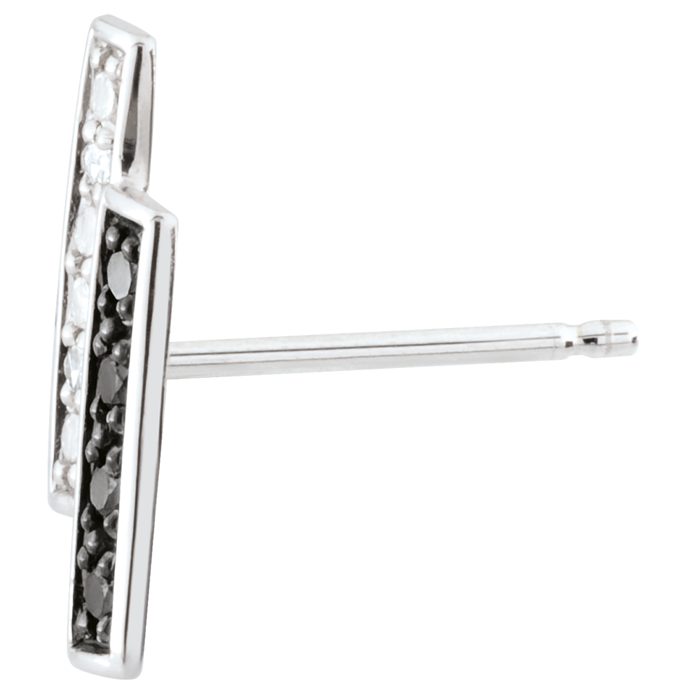 Die geometrische Form dieser Ohrstecker verbinden auf dezente Art und Weise einen edlen Kontrast von hell und dunkel. 4 Diamanten : 0.02 Karat - Weißgold (375/-): 0.7 g. Schwarzer Diamant : 8 - Total: 0.064 Karat Weitere Abmessungen