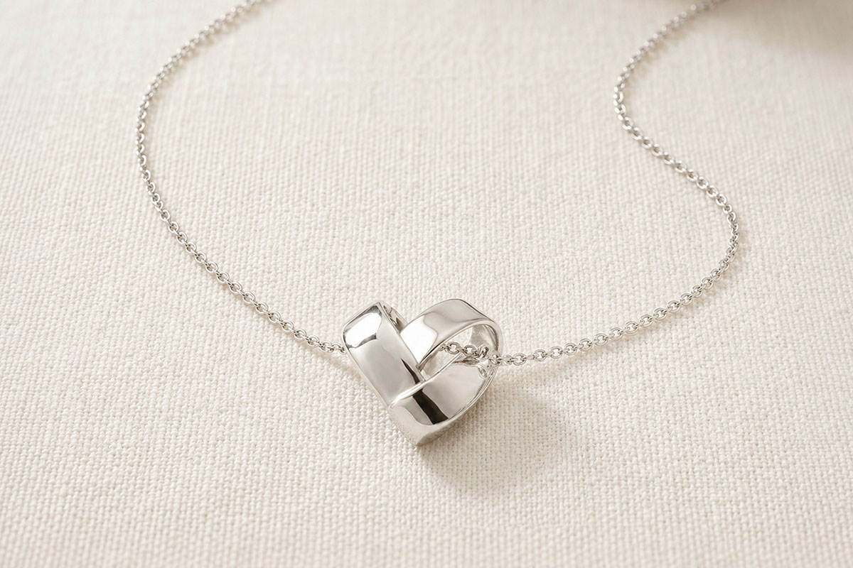 Ein Herzanhänger aus einem zart gefalteten Goldband, frei beweglich an einer feinen Kette.