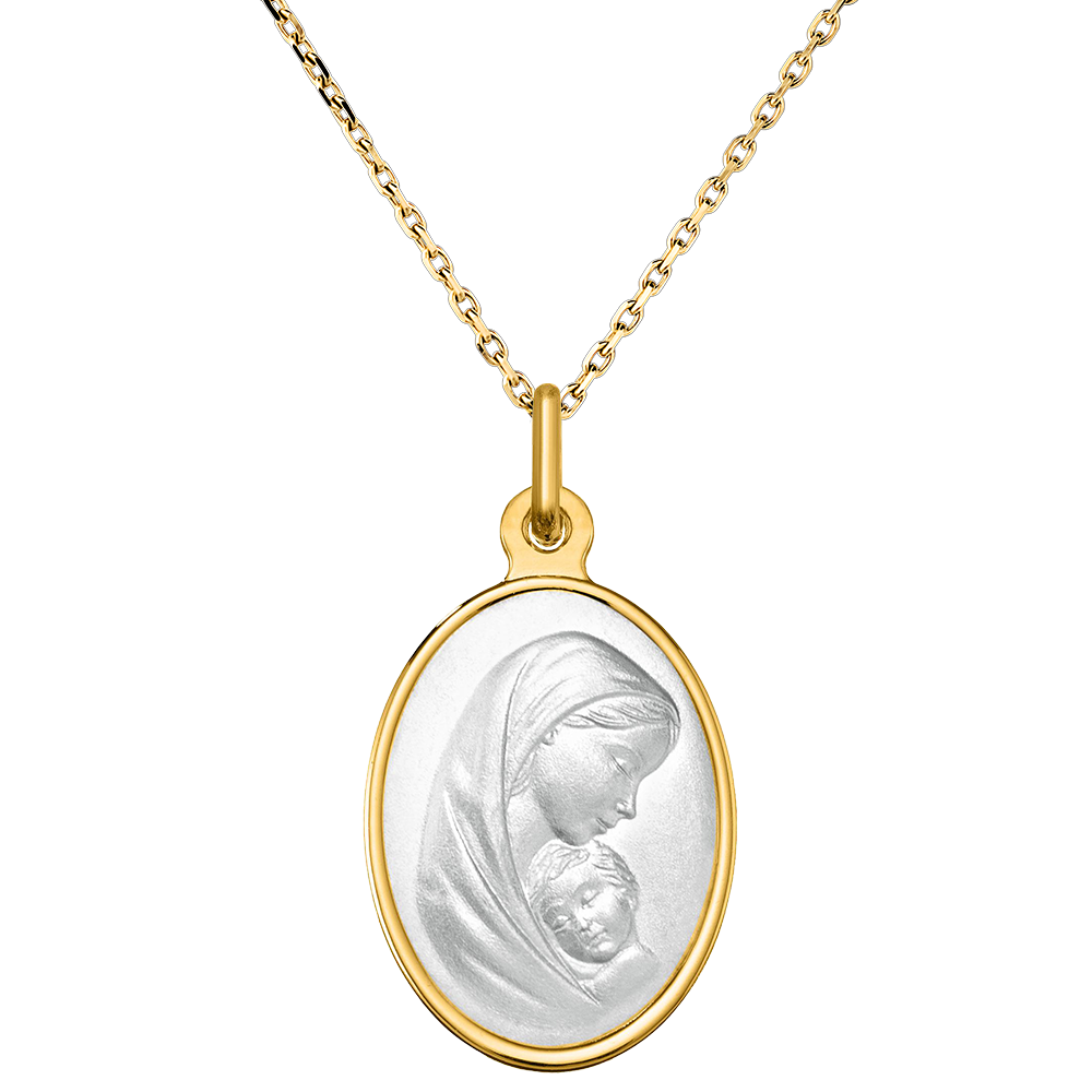 Diese Medaille aus 18-karätigem Gelbgold betont die unendliche Zärtlichkeit zwischen der Jungfrau Maria und dem Jesuskind. Die sorgfältig geschnitzte Szene fängt die Weichheit und Gelassenheit dieses heiligen Moments ein, verewigt in einer eleganten ovalen Form. Der subtile Kontrast zwischen dem glänzenden Perlmutt und dem Gelbgold hebt die feinen Details ihrer Gesichter hervor und schafft ein sowohl sanftes als auch zeitloses Schmuckstück. Ein ideales spirituelles Schmuckstück zur Markierung religiöser Anlässe wie Taufe oder Kommunion.