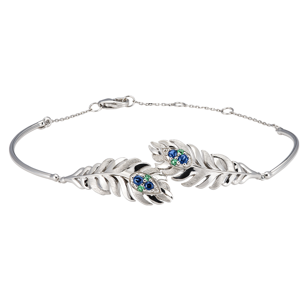Das Signature-Armband aus 9 Karat Weißgold zeigt ein elegantes Federmotiv, das mit 8 synthetischen Smaragden und Saphiren verziert ist. Fein gearbeitet, schließt sich das eingehüllte Design mit einem diskreten Verschluss. Ein raffiniertes Stück, das die luftige Essenz und die unvergleichliche Raffinesse der Federn einfängt, das Markenzeichen der Panache-Kollektion.