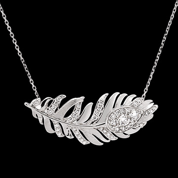 Die Signature-Halskette aus 18 Karat Weißgold zeigt einen eleganten Anhänger mit Federmotiv, der mit 44 synthetischen Diamanten verziert ist. Ein Stück, das die luftige Essenz und die unvergleichliche Raffinesse der Federn einfängt, das Markenzeichen der Panache-Kollektion. Mit Kette 42 cm + Verlängerung von 3 cm; 750/-. Weißgold (750/-): 4.6 g. Labordiamant : 44 - Total: 0.48 Karat Weitere Abmessungen