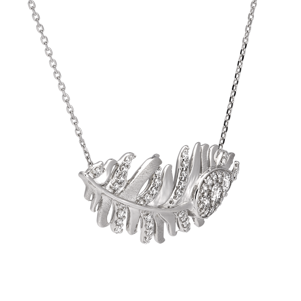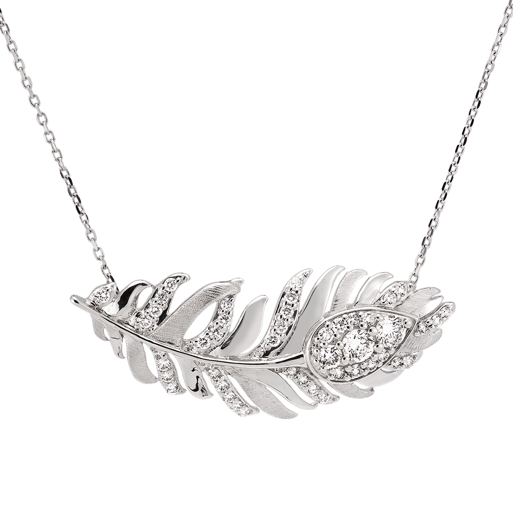 Die Signature-Halskette aus 9 Karat Weißgold zeigt einen eleganten Anhänger mit Federmotiv, der mit 44 synthetischen Diamanten verziert ist. Ein Stück, das die luftige Essenz und die unvergleichliche Raffinesse der Federn einfängt, das Markenzeichen der Panache-Kollektion.