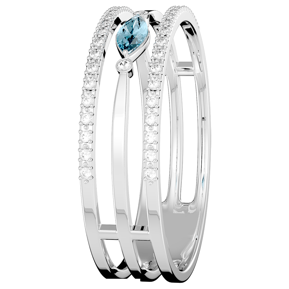Zwei zarten Augenlidern gleich, schützen die diamantbesetzten Goldlinien den kostbaren Augapfel, welcher durch einen blauen Topas verkörpert wird. Ein aufwendig gestalteter Ring, welcher sich hervorragend im Alltag oder als Eyecatcher zu besonderen Anlässen tragen lässt. Zentraler Stein: Länge: 6 mm - Breite: 3 mm. 32 Diamanten : 0.14 Karat - Weißgold (375/-): 2.3 g. Blauer Topas : 1 - Diamant : 32 - Total: 0.27 Karat Weitere Abmessungen