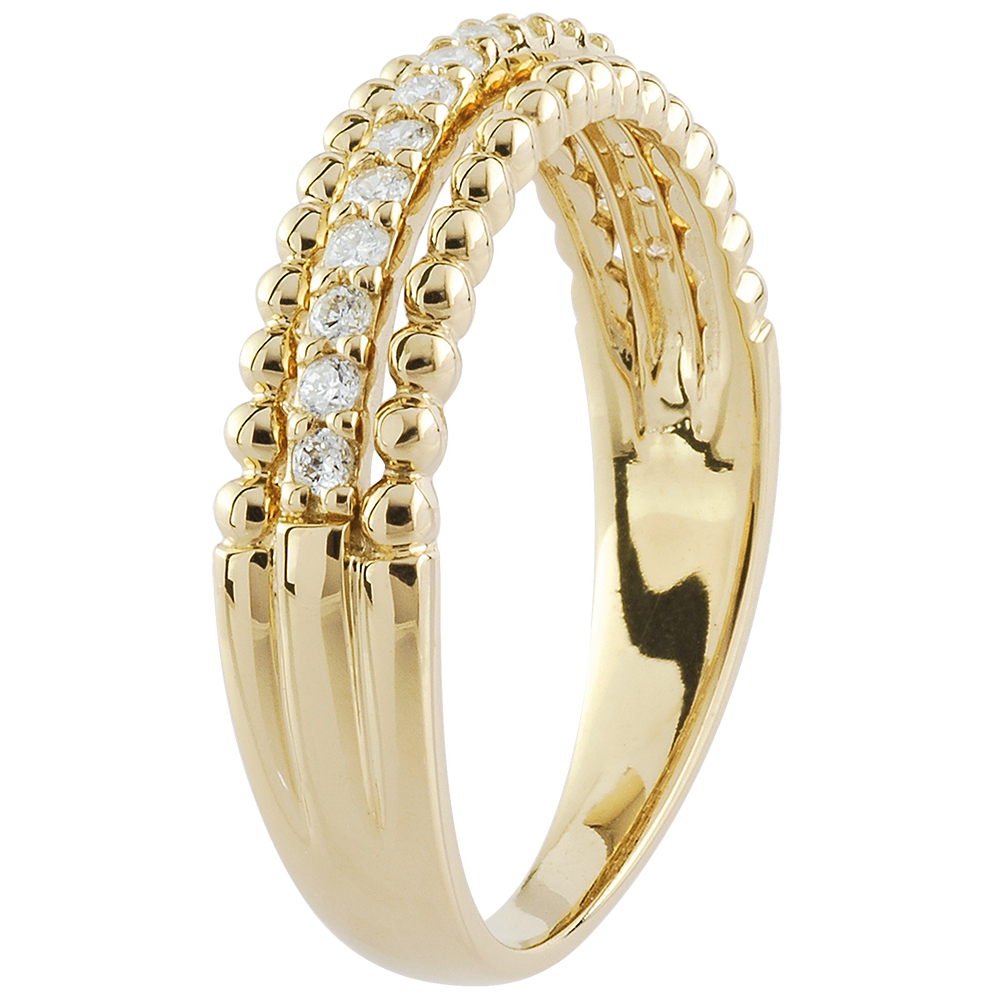 Zwei Reihen aus edlen Goldperlen umrahmen auf würdevolle Weise einen emporgehobenen Diamantring und bilden einen einzigartigen Trauring. Selbstverständlich kann dieses Modell auch ohne symbolischen Charakter als modisches Accessoire getragen werden.