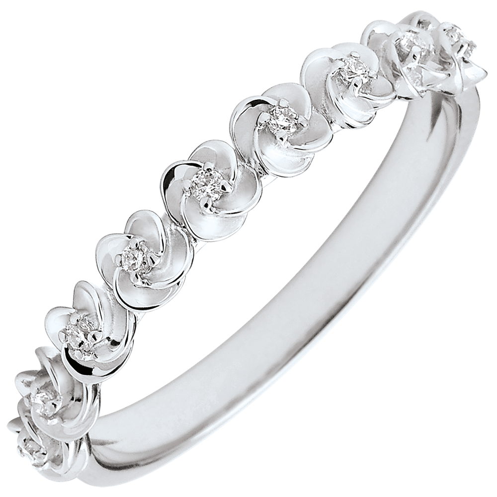 Die zarten Blütenblätter dieses Ringes öffnen sich, damit wir ihr Herz aus Diamanten entdecken. Zusammen bilden sie eine raffinierte Krone aus leuchtenden Blumen.