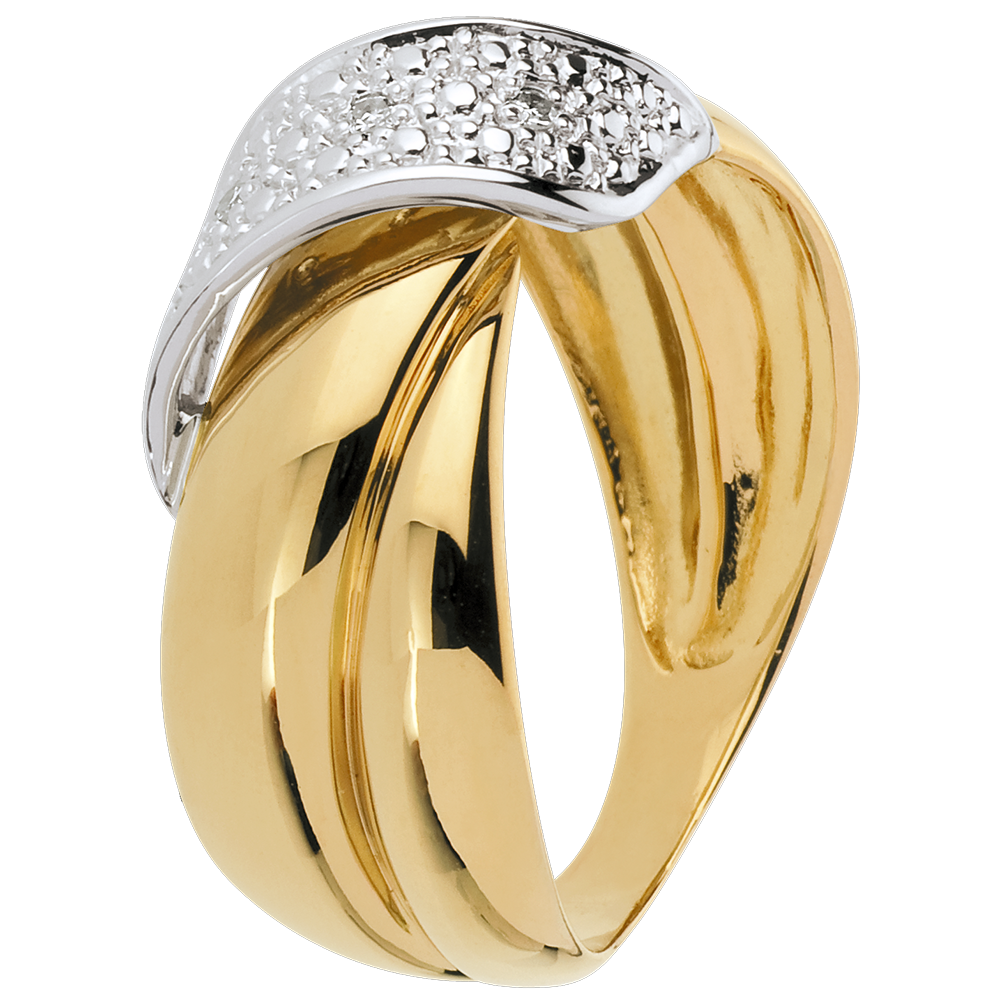 Ein Doppelring aus Gelbgold wird von einem Band aus Weissgold und Diamanten umschlungen.