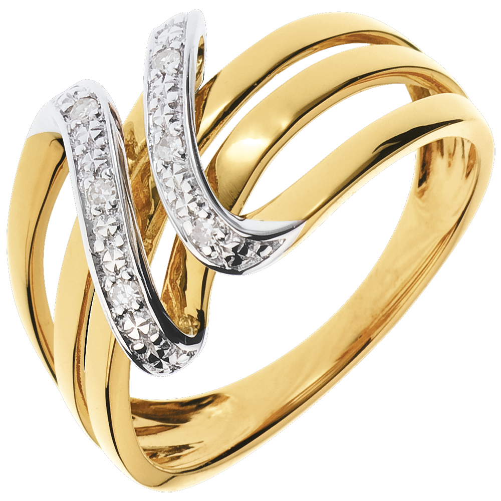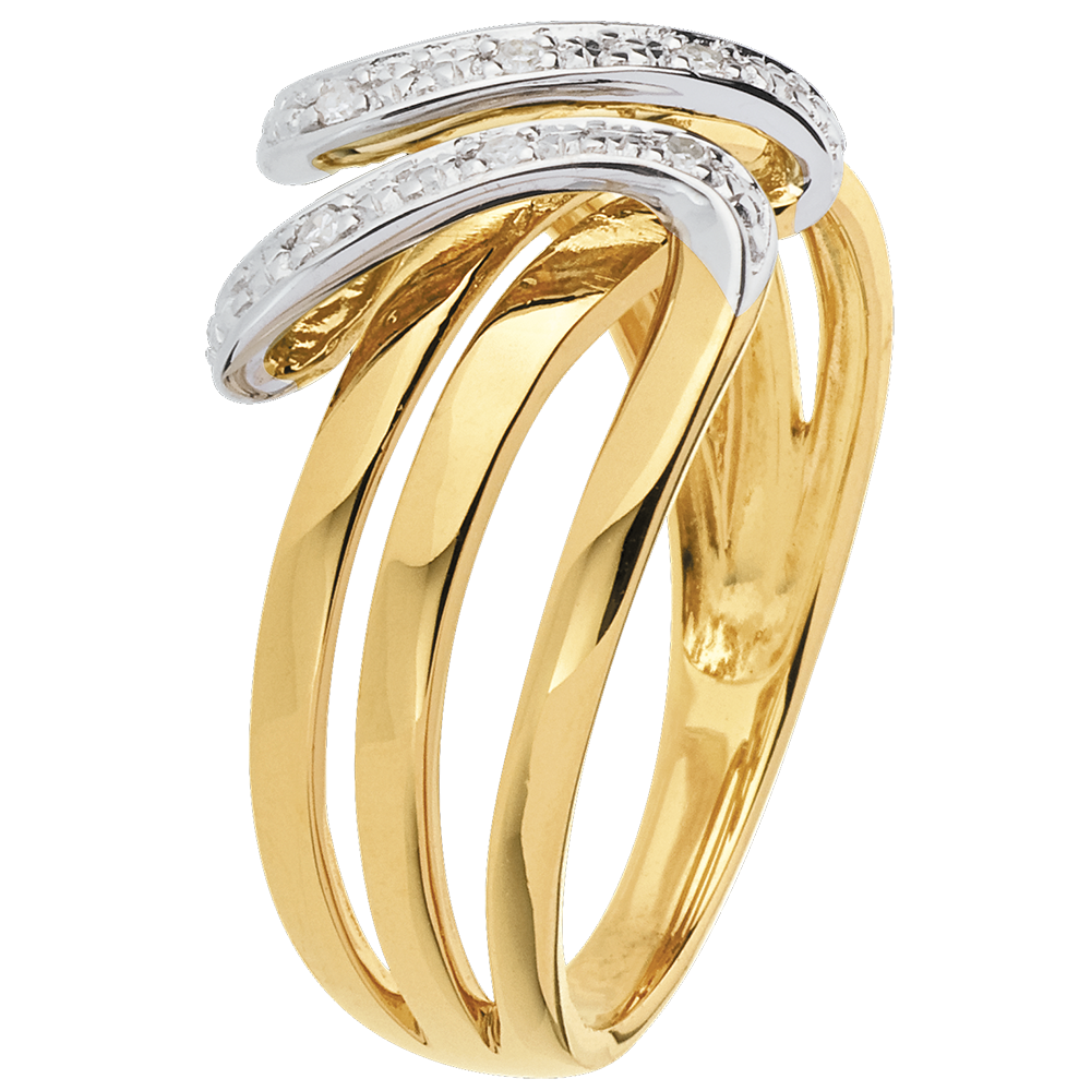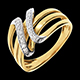 Ein Ring, der sich zu bewegen scheint! Die harmonisch geschwungene Fassung aus Gelbgold ist veredelt durch zwei diamantbesetzte Bögen. 6 Diamanten : 0.04 Karat - Weiß-und Gelbgold (750/-): 3.4 g. Weitere Abmessungen