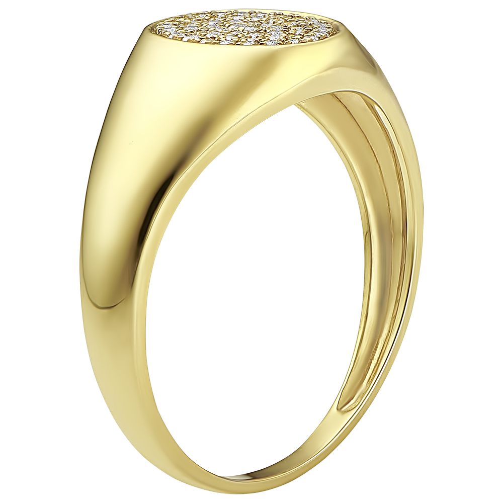 Ein Siegelring aus Gelbgold, dessen ovale Siegelpartie von einem großzügigen 50 Diamanten-Pavé geziert wird. 50 Diamanten : 0.17 Karat - Gelbgold (375/-): 3.8 g. Weitere Abmessungen