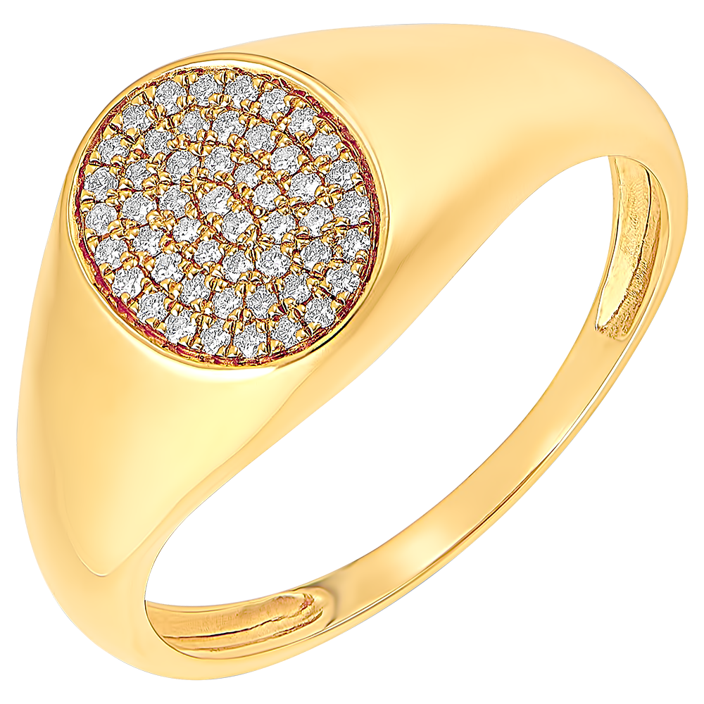 Ein Siegelring aus Gelbgold, dessen ovale Siegelpartie von einem großzügigen 50 Diamanten-Pavé geziert wird. 50 Diamanten : 0.17 Karat - Gelbgold (750/-): 4.5 g. Weitere Abmessungen