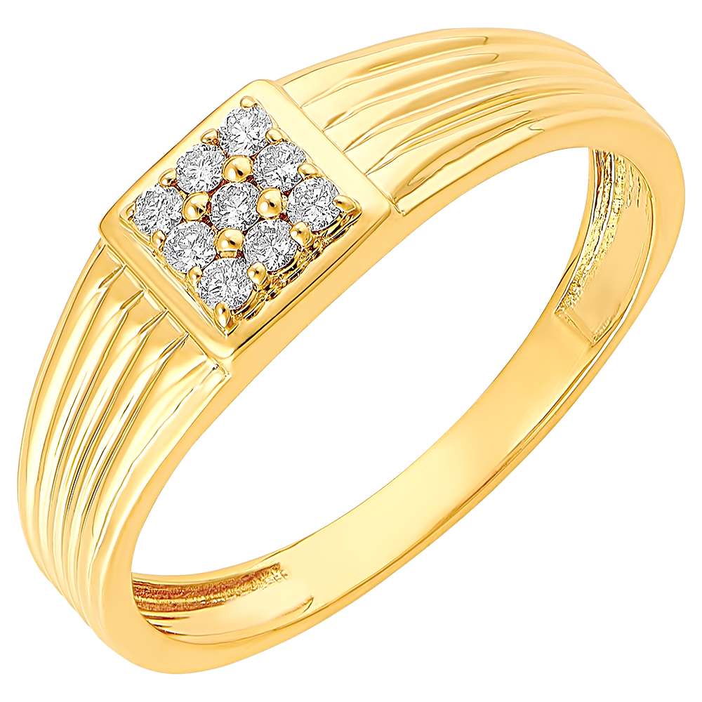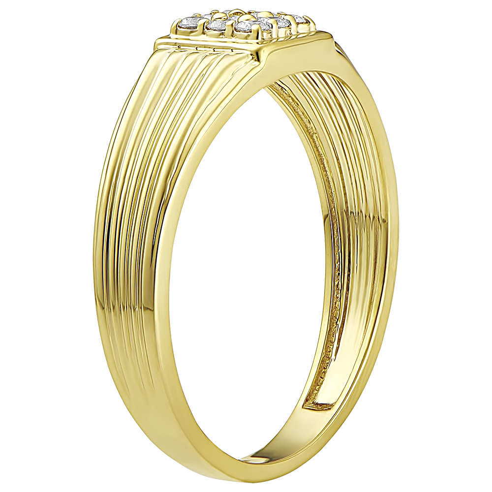 Ein Siegelring mit zart gerillter Gelbgoldbasis und Siegelpartie mit großzügigem 9 Diamanten-Pavé.