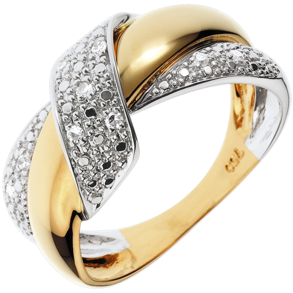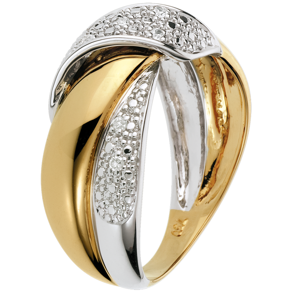 Ein Doppelring aus Gelbgold und Weissgold wird von einem edlen Band aus Diamanten umschlungen.