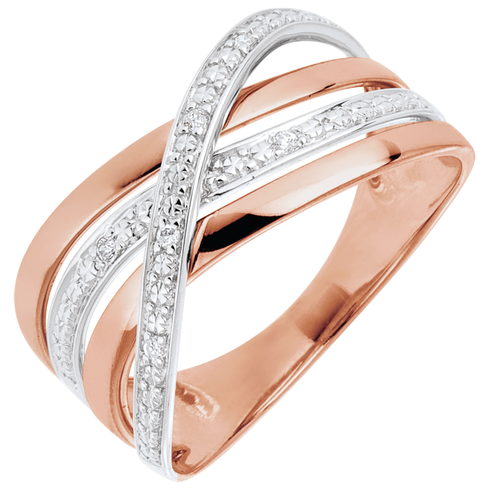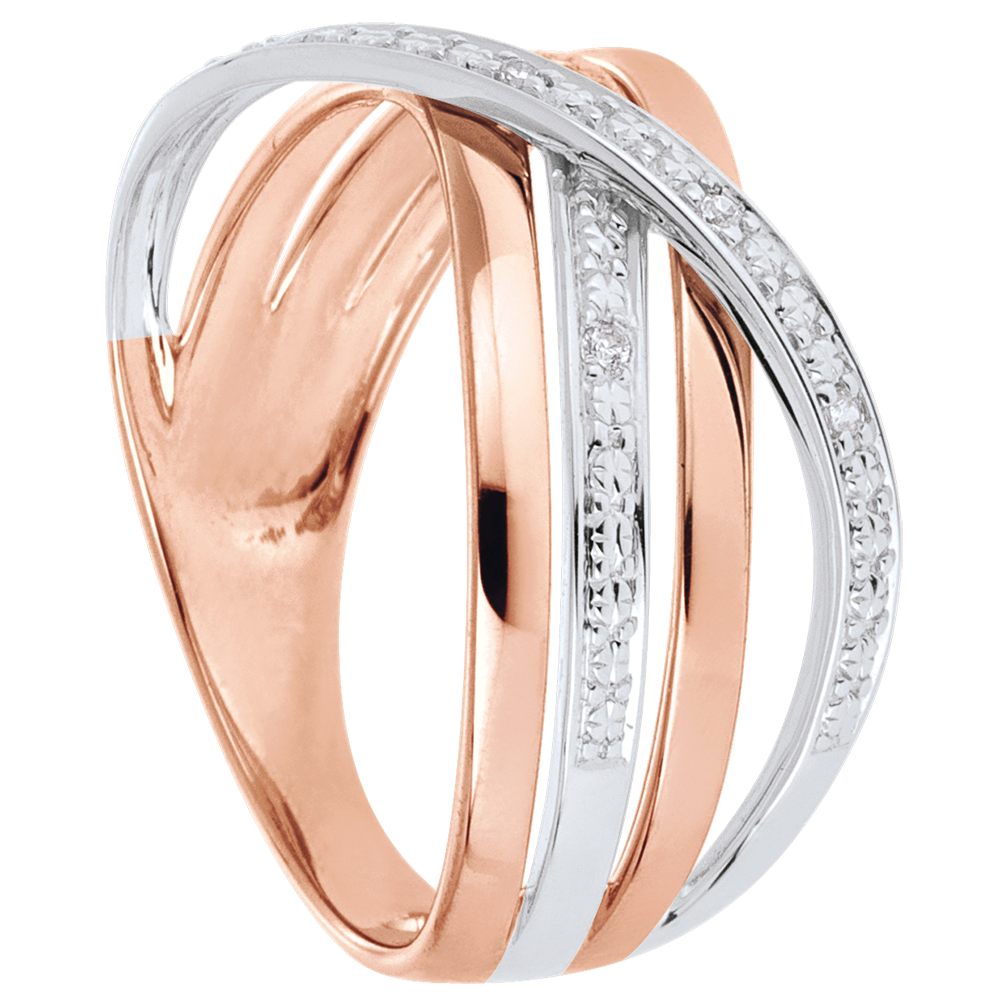 Ein Dreiergespann in Weiß- und Roségold, welches förmlich von einer Diamantwelle durchzogen wird. 6 Diamanten : 0.03 Karat - Weiß-und Rotgold (750/-): 3.2 g. Weitere Abmessungen