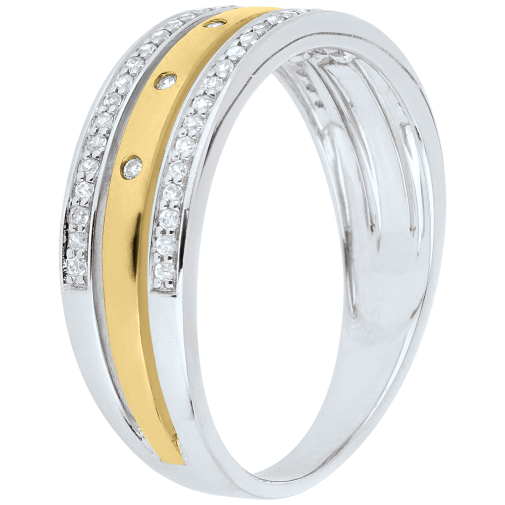 Zwei diamantbesetzte Ringe in Weißgold umgeben einen gelbgoldenen Ring, welcher sich mit fünf Diamanten präsentiert. 55 Diamanten : 0.18 Karat - Weiß-und Gelbgold (375/-): 2.1 g. Weitere Abmessungen