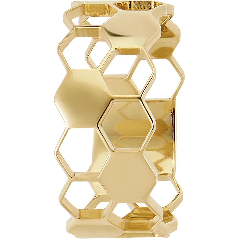 Lassen Sie sich von der subtilen Eleganz des schmalen Rings Enthüllung aus reinem Gold verzaubern, ein außergewöhnliches Stück, inspiriert vom kostbaren Werk der Bienen. Der Ring besteht aus zwei Reihen fein gearbeiteter Goldwaben und ist mit 9 goldgefüllten Waben verziert, die das Licht auf spektakuläre Weise einfangen.