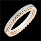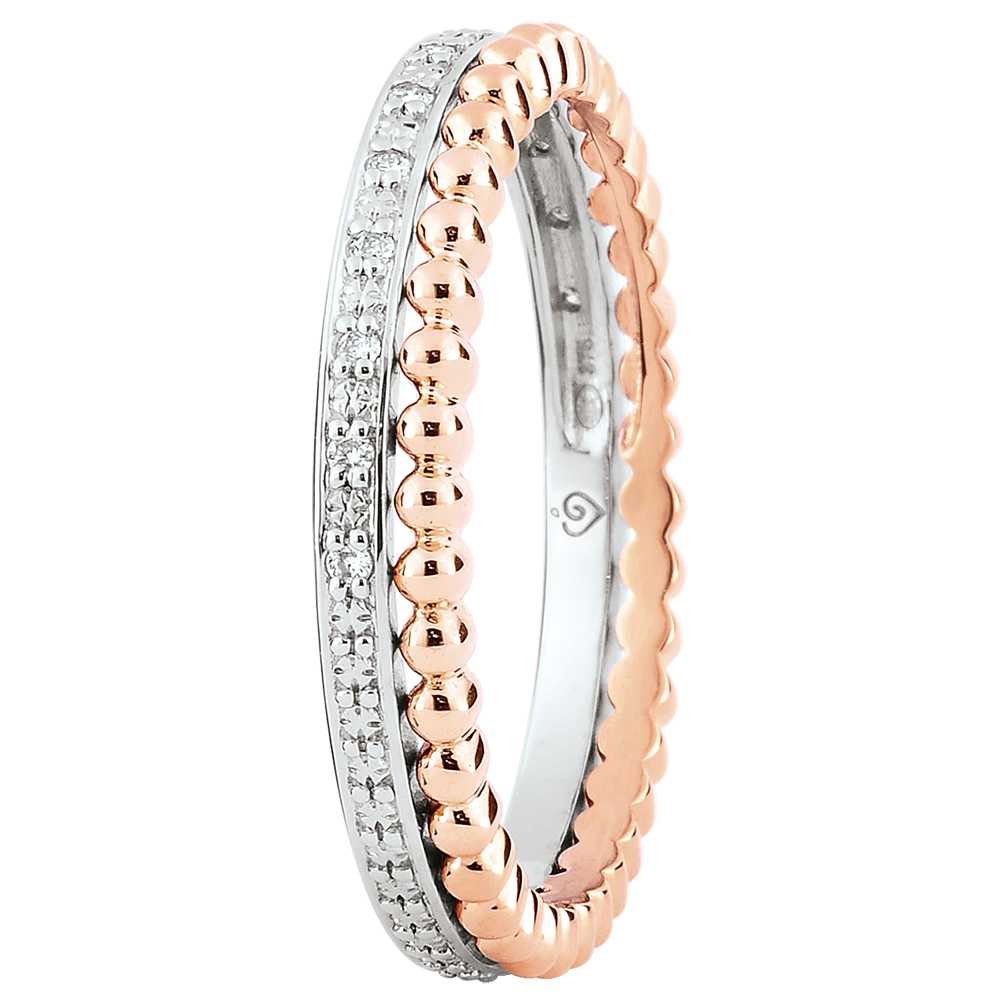 Ein mit Diamanten besetzter Ring in Weißgold vereint mit einem Ring aus roségoldenen Perlen bilden ein anmutiges Duo. Ein Trauring mit weiblicher Note, klassisch und originell zugleich.