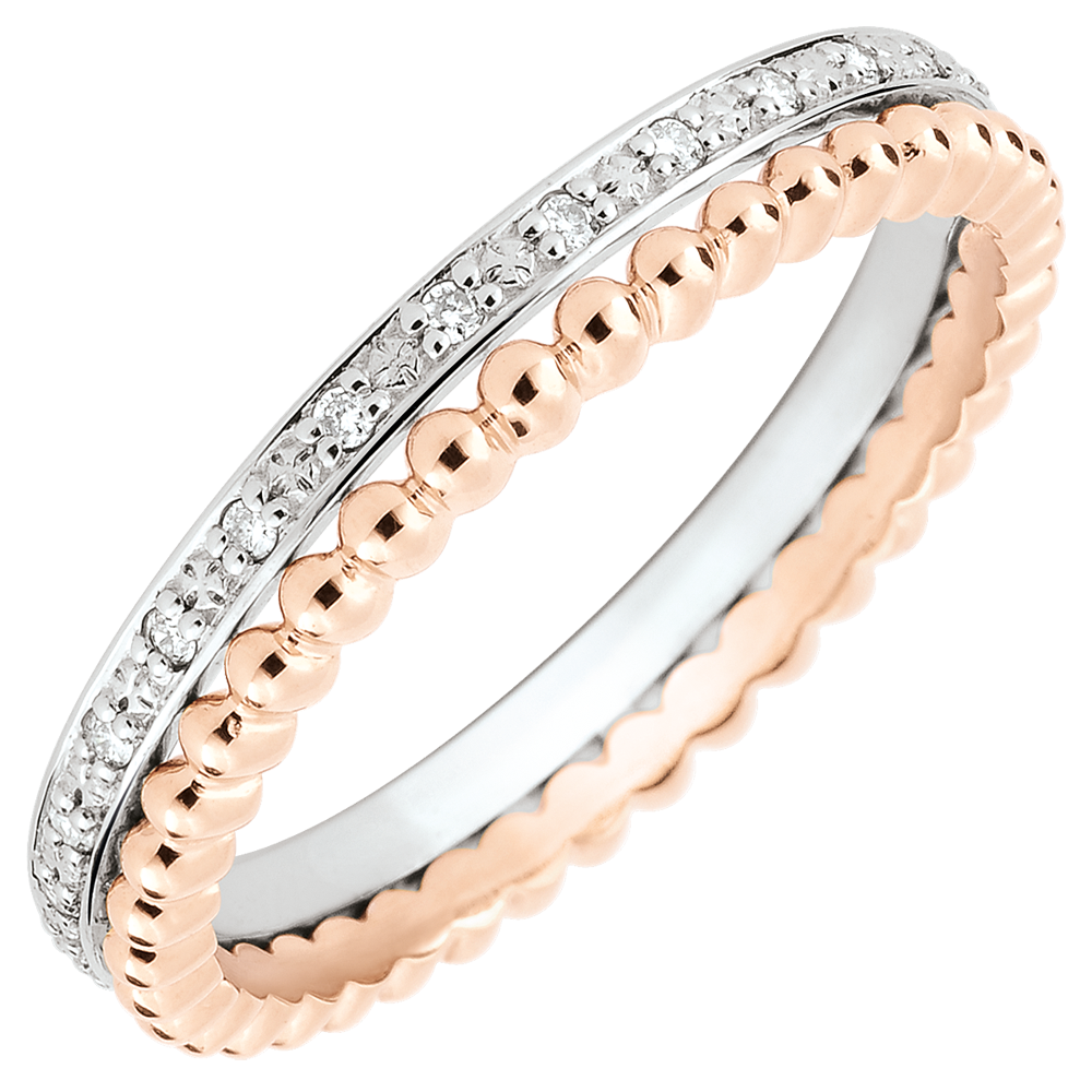 Ein mit Diamanten besetzter Ring in Weißgold vereint mit einem Ring aus weißgoldenen Perlen bilden ein anmutiges Duo. Ein Trauring mit weiblicher Note, klassisch und originell zugleich.