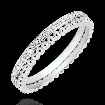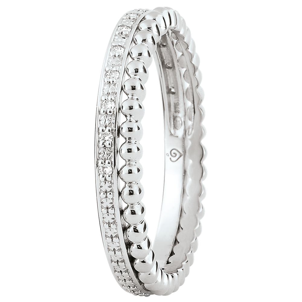 Ein diamantbesetzter Ring in Weißgold vereint mit einem Ring aus weißgoldenen Perlen bilden ein anmutiges Duo. Ein Trauring mit weiblicher Note, klassisch und originell zugleich.