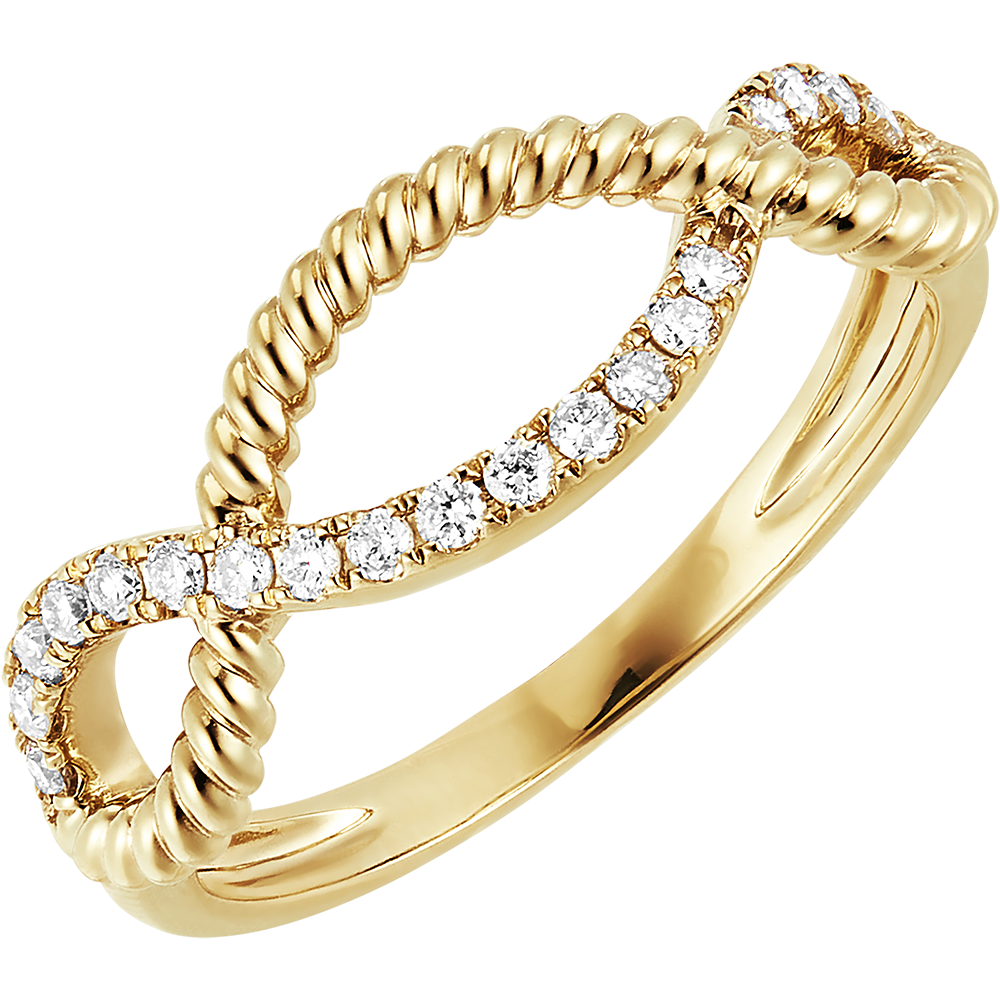 Ein Ring, in dem sich zwei Goldseile ineinander verschlingen, Gelbgold und Gelbgold mit Diamantpavé wie eine ewige Umarmung.