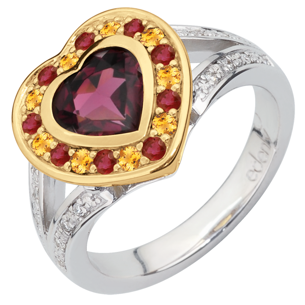 Ein Rhodolite in Form eines Herzens liegt auf einer Fassung aus Silber und Diamanten, umrandet von Halbedelsteinen: Citrinen und Granaten.… 16 Diamanten : 0.06 Karat - Sterlingsilber 925/-: 4.7 g. Rhodolit : 1 - Citrin gelb : 9 - Granat : 9 - Diamant : 16 - Total: 1.8 KaratMehr sehen Technische Informationen