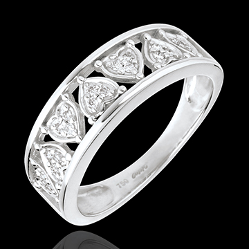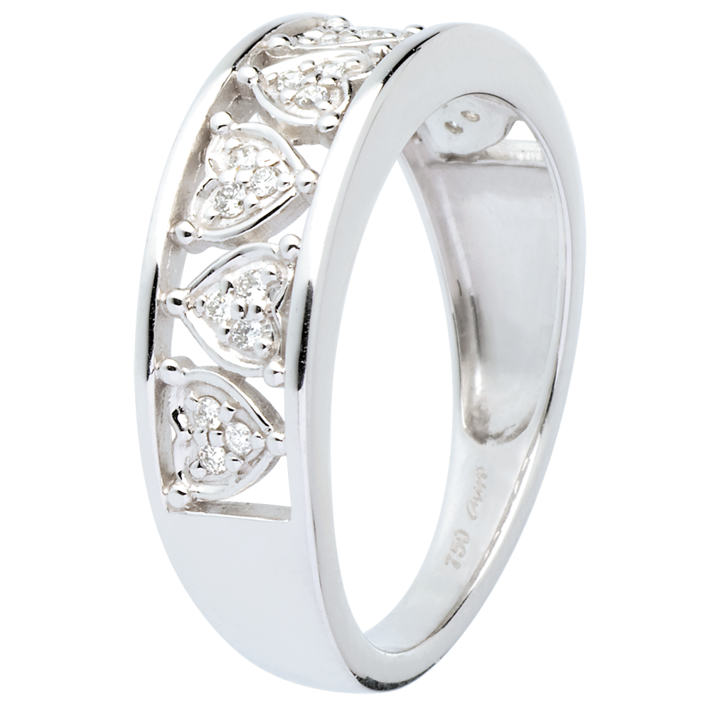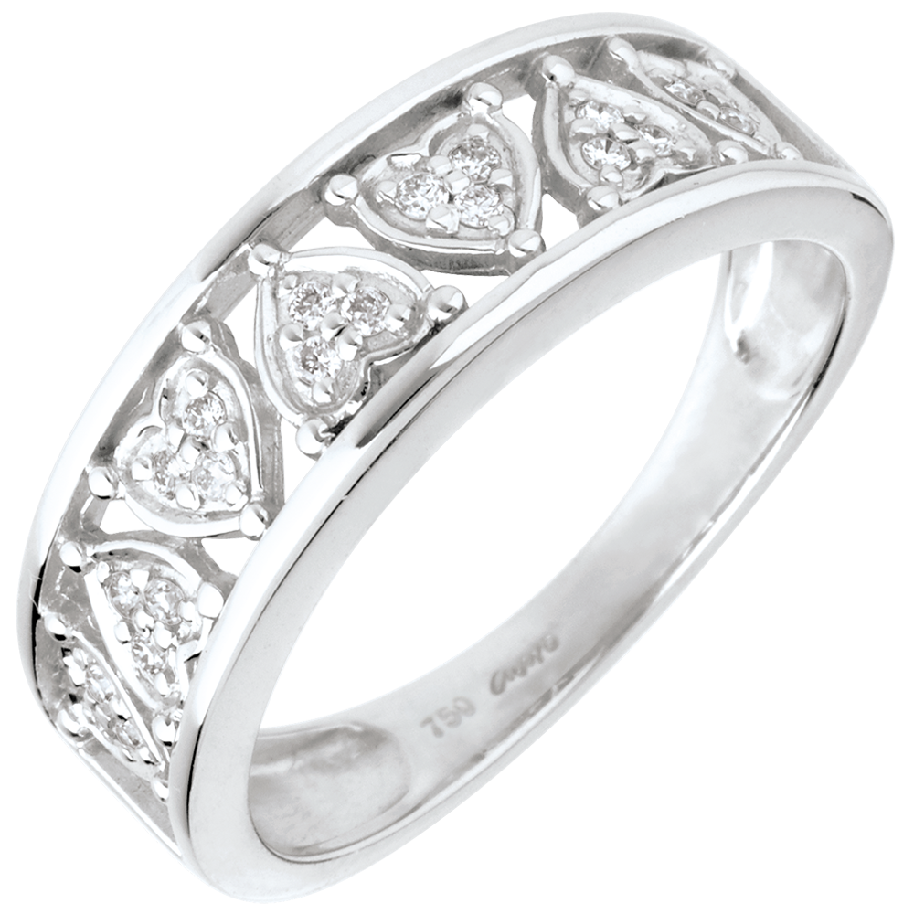 Funkelnde Diamantherzen in einer weißgoldenen Fassung, welche die Weiblichkeit dieses Ringes perfekt zur Geltung bringen. 21 Diamanten : 0.1 Karat - Weißgold (750/-): 3.7 g. Weitere Abmessungen