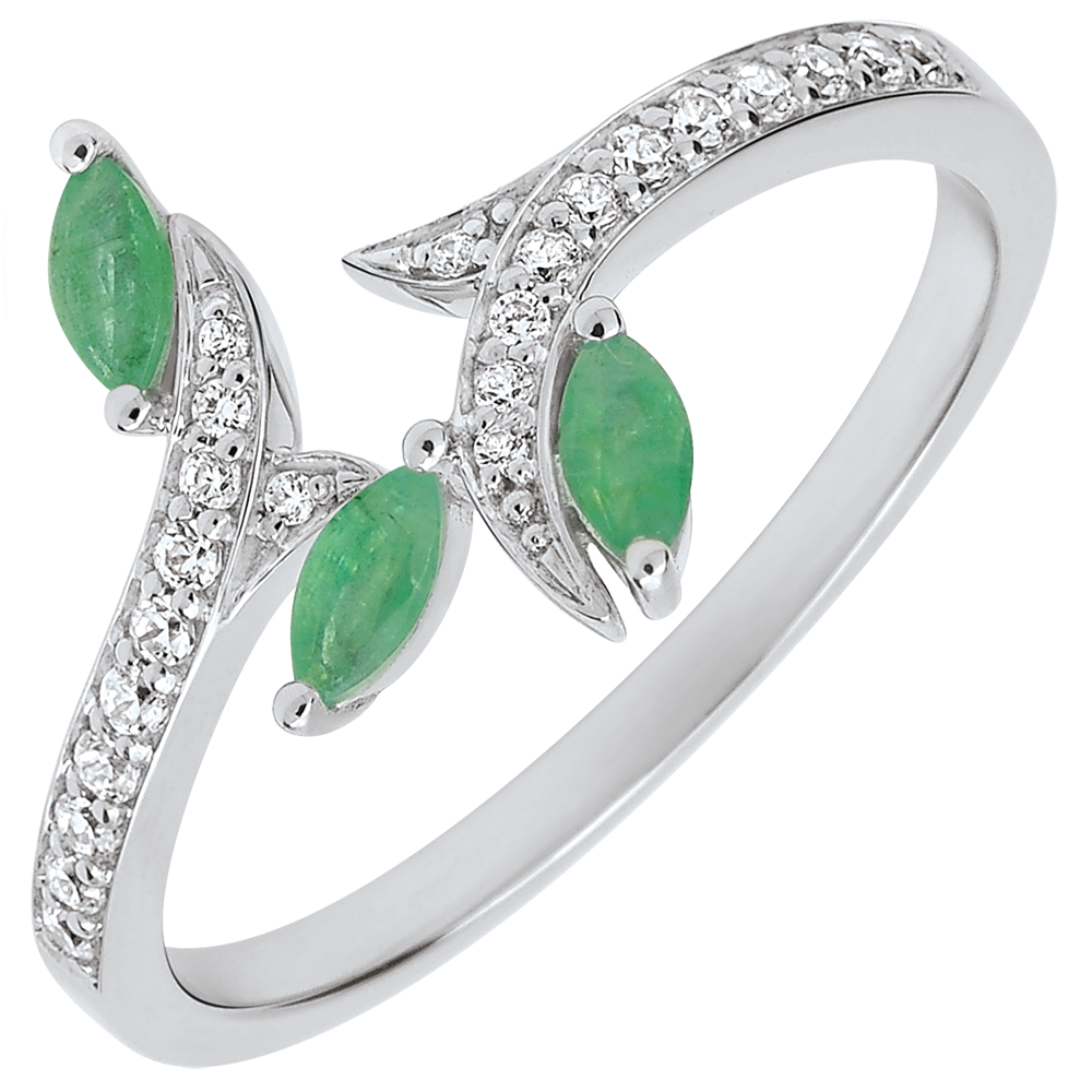 Ein funkelnder Zweig erstarrt im Zeitlosen. Man kann nicht sagen, ob er über tausend Jahre alt ist oder soeben erst zum Leben erweckt wurde. Seine kostbaren Blätter, smaragd in Marquisenform, werden durch das Weißgold und zusätzliche Brillanten perfekt in Szene gesetzt.