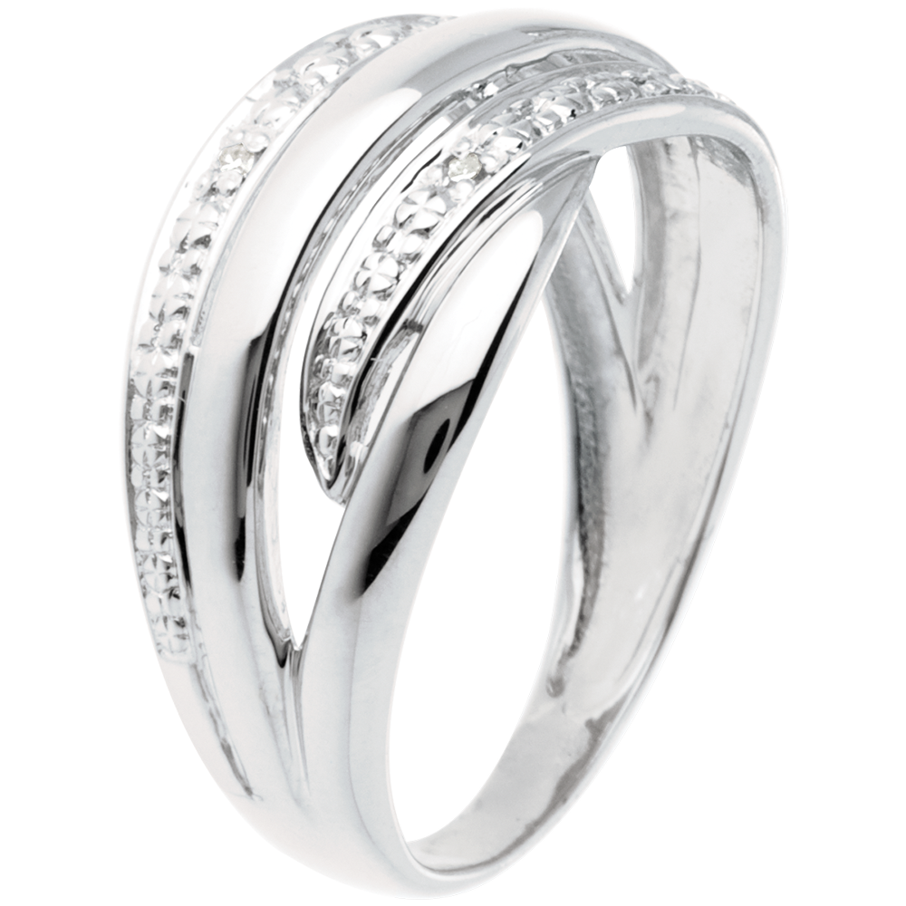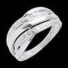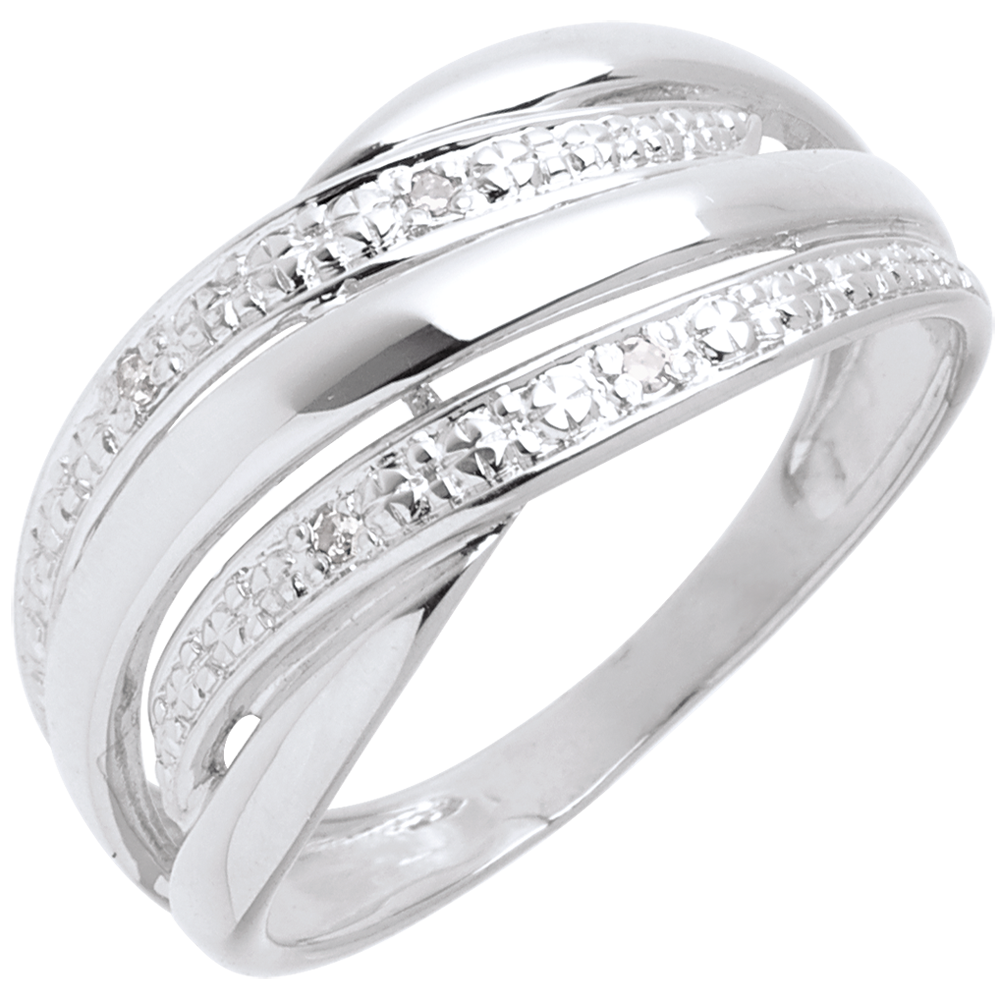Ein arabeskenartiger Ring in Schlangenform zweireihig besetzt mit glänzenden Diamanten. 4 Diamanten : 0.02 Karat - Weißgold (750/-): 2.7 g. Weitere Abmessungen