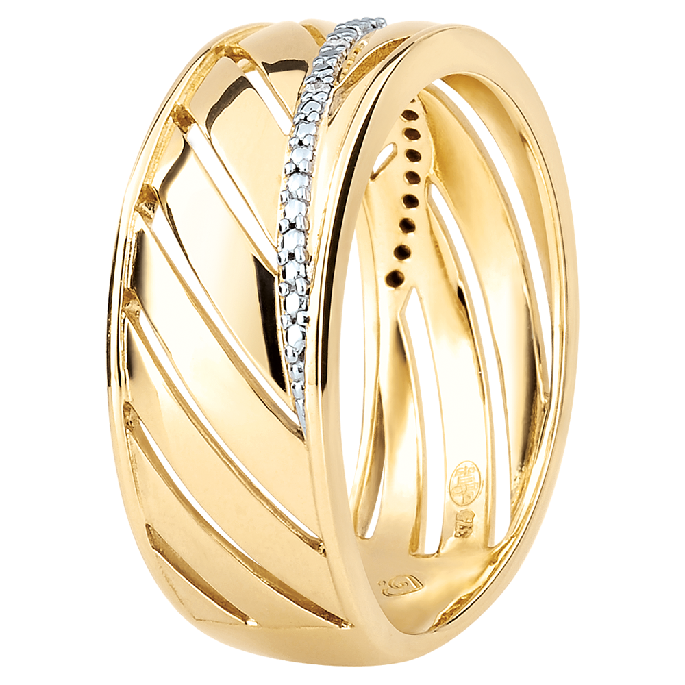 Ein breiter Ring in Gelbgold, der seine Inspiration aus der Leichtigkeit eines Palmenblattes schöpft. Sein Hauptstrang ist mit einer Vielzahl kleiner Diamanten verziert. Ein Ring, den man sowohl jeden Tag, als auch zu besonderen Anlässen tragen kann. 5 Diamanten : 0.02 Karat - Gelbgold (375/-): 3.3 g. Weitere Abmessungen