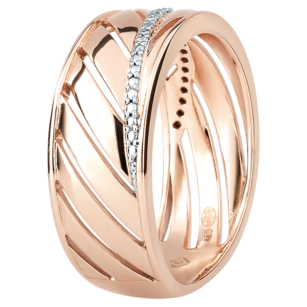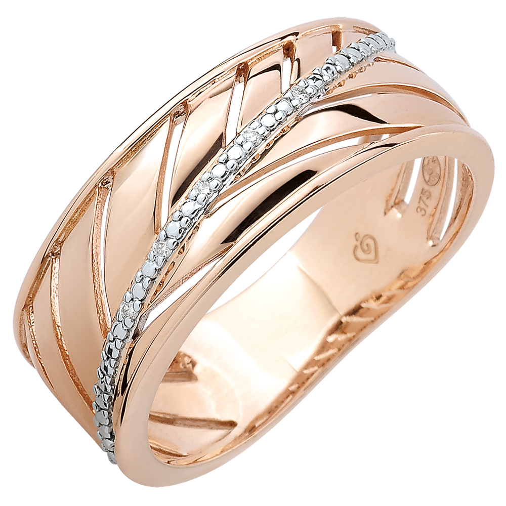 Ein breiter Ring in Roségold, der seine Inspiration aus der Leichtigkeit eines Palmenblattes schöpft. Sein Hauptstrang ist mit einer Vielzahl kleiner Diamanten verziert. Ein Ring, den man sowohl jeden Tag, als auch zu besonderen Anlässen tragen kann.