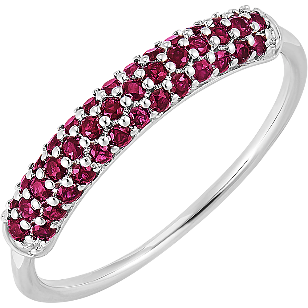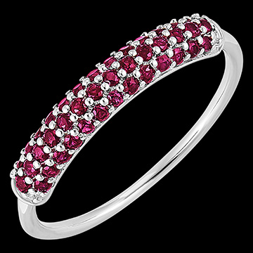 Ein Ring aus Weißgold, der in drei Reihen mit 40 zarten Rubinen besetzt ist. Ein klassisches und zugleich zeitloses Schmuckstück für eine farbenfrohe Note.