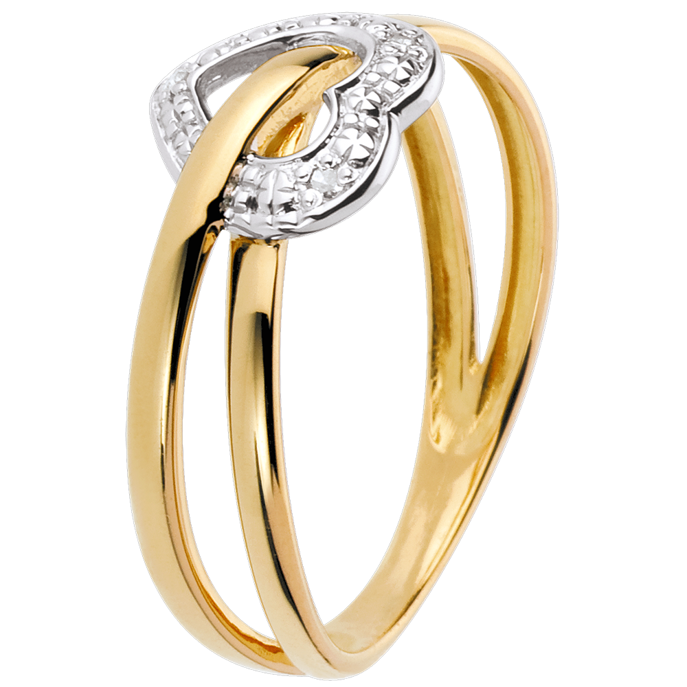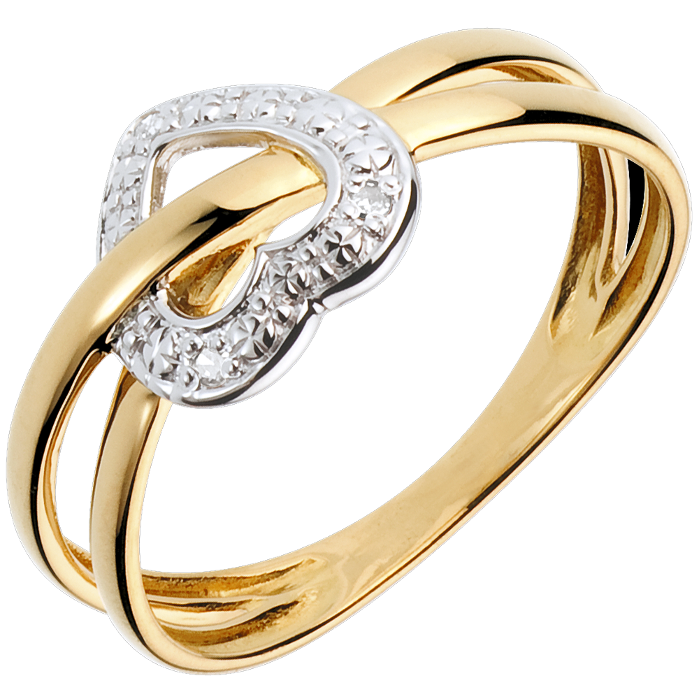 Ein Herz aus Weissgold, besetzt mit Diamanten, wird durchlaufen von zwei sich kreuzenden Ringen aus Gelbgold - ein ausgefallenes Schmuckstück.