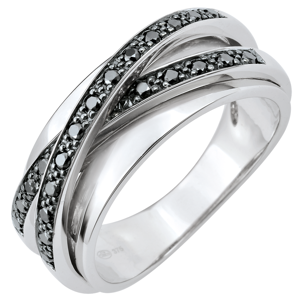 Eine kunstvolle Verschlingung von Weißgoldringen, ganz mit funkelnden schwarze Diamanten besetzt. Weißgold (375/-): 4.1 g. Schwarzer Diamant : 23 - Total: 0.207 Karat Weitere Abmessungen