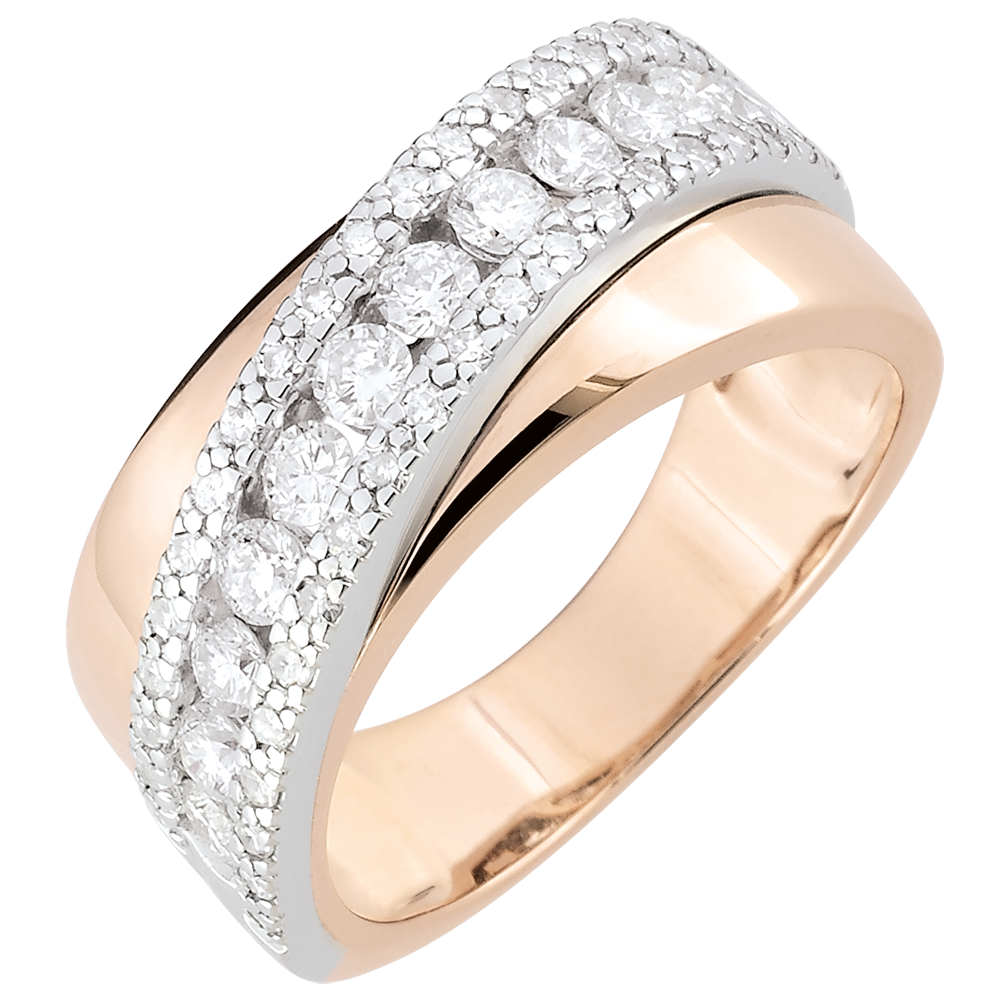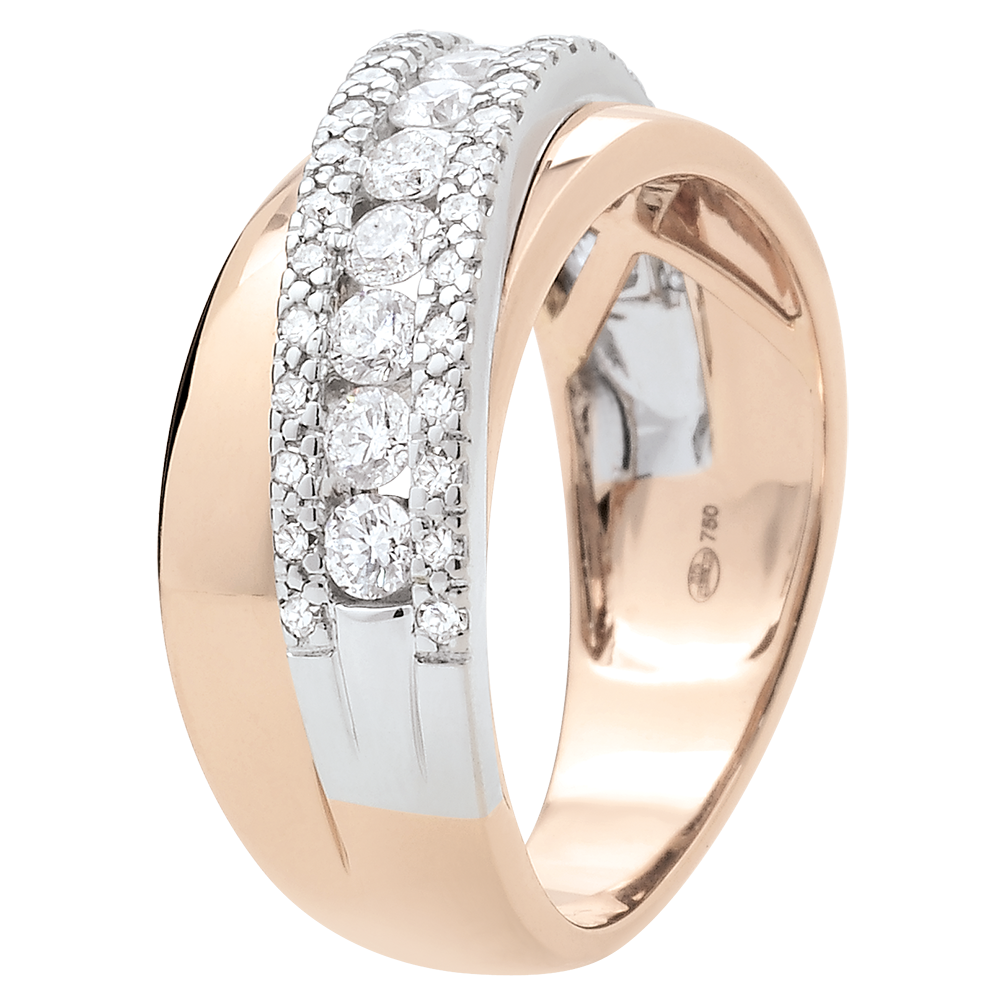 Ein edles Band, welches großzügig mit erlesenen Diamanten besetzt ist, umkreist einen breiten Ring in elegantem Roségold. 52 Diamanten : 0.79 Karat - Weiß-und Rotgold (375/-): 4.8 g. Weitere Abmessungen
