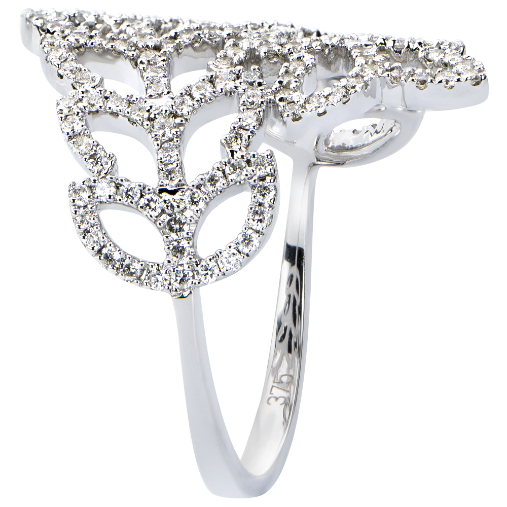Bukolische Romantik für diesen so frischen und femininen Ring, in dem sich eine durchbrochene, mit Diamanten besetzte Flora verflechtet. Die ganze Zartheit der Formen der Natur in einem subtilen und fast magischen Schmuckstück. 144 Diamanten : 0.53 Karat - Weißgold (375/-): 3.3 g. Weitere Abmessungen