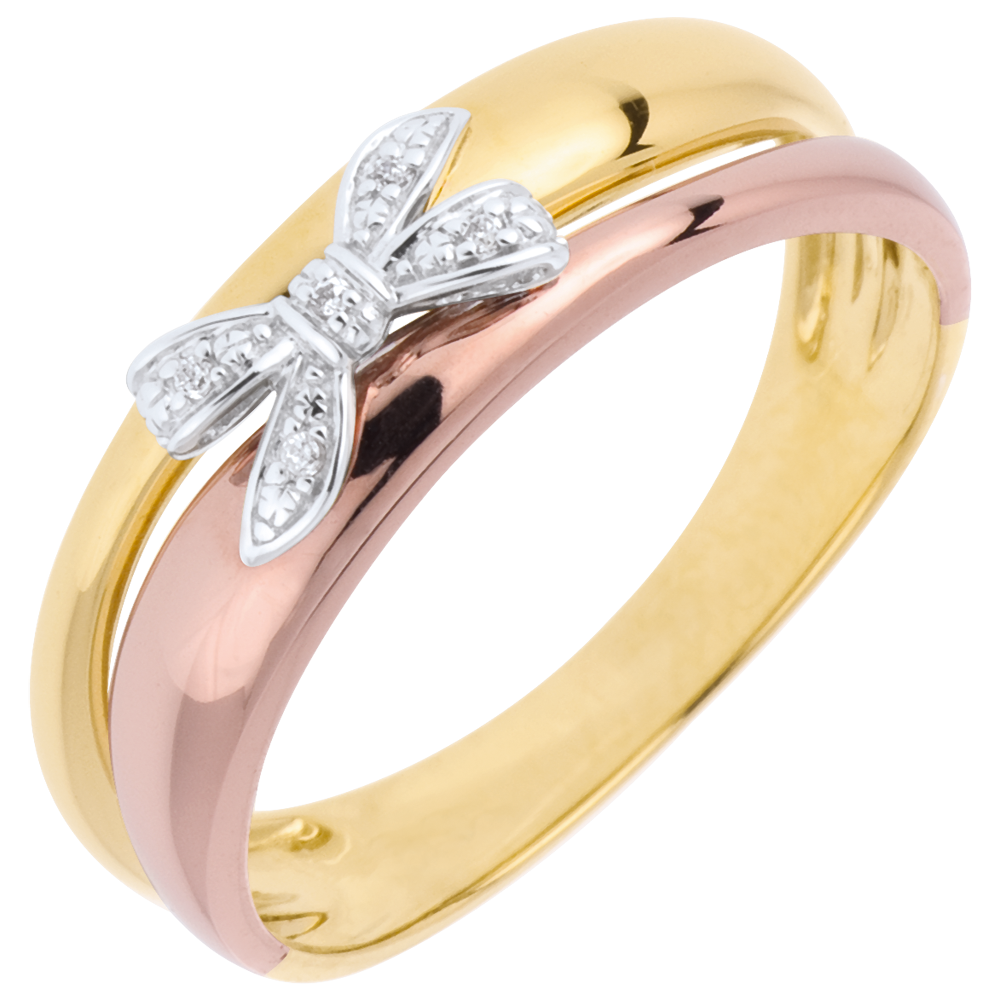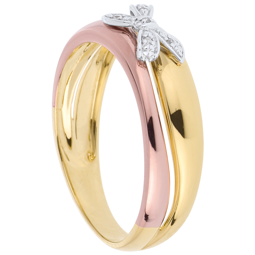 Eine wunderschöne Komposition aus einem Gold-Trio mit einer Schleife aus Weißgold und Diamanten für einen sehr femininen Ring. 5 Diamanten : 0.02 Karat - Tricolor (375/-): 2.1 g. Weitere Abmessungen
