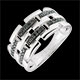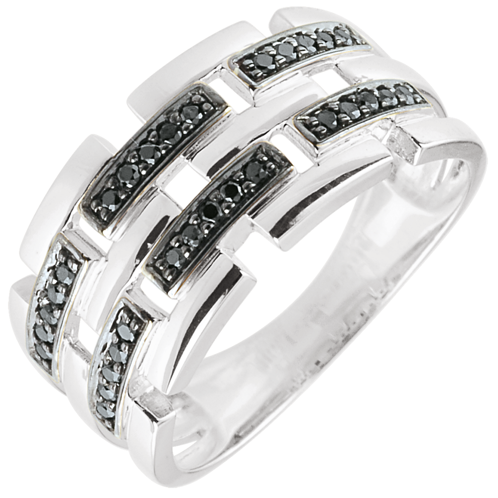 Ein erlesener Goldring, welcher sich stellenweise in eine Dreierreihe spaltet und von edlen schwarzen Diamanten unterbrochen wird. Die Ringe der Dämmerschein-Kollektion wirken modern und sehr feminin. 30 Diamanten : 0.15 Karat - Weißgold (750/-): 3.5 g. Weitere Abmessungen