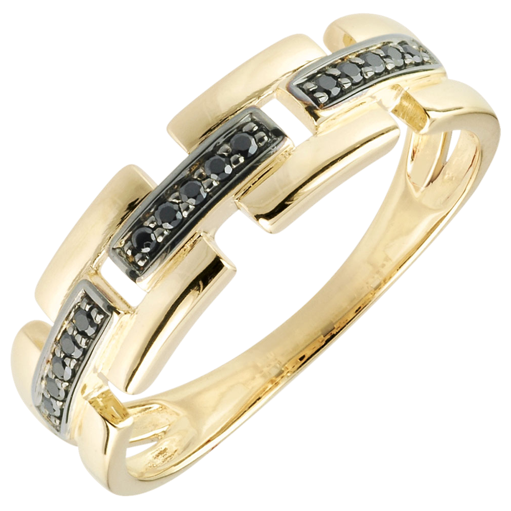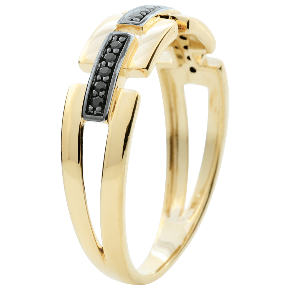 Ein erlesener Goldring, welcher sich stellenweise in eine Zweierreihe spaltet und von edlen schwarzen Diamanten unterbrochen wird. Die Ringe der Dämmerschein-Kollektion wirken modern und sehr feminin. 15 Diamanten : 0.08 Karat - Gelbgold (750/-): 2.3 g. Weitere Abmessungen