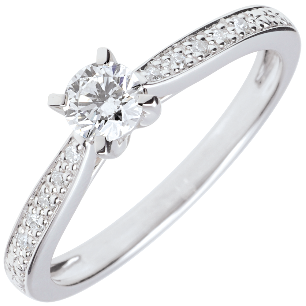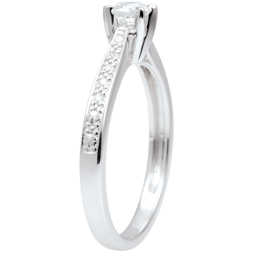 Ein Diamantsolitär wird von 8 Krappen auf eine Diamantenfassung festgehalten. Mitteler Diamant: 0.25 Karat. 11 Diamanten : 0.3 Karat - Weißgold (375/-): 2.2 g. Weitere Abmessungen