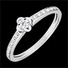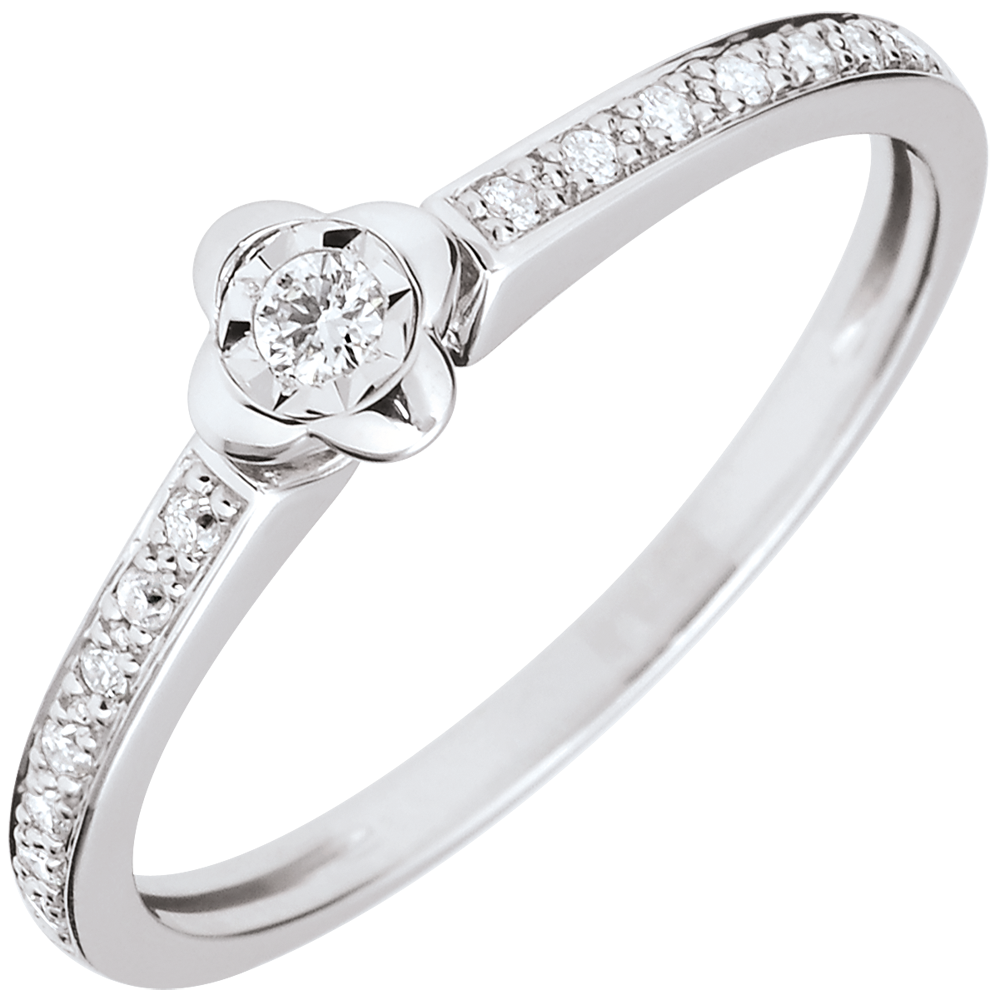 Eine empfindliche Blume trägt einen Diamantensolitär auf seinem Diamantenring. Zentrierter Diamant: 0.03 Karat 15 Diamanten : 0.09 Karat - Weißgold (750/-): 1.7 g. Weitere Abmessungen