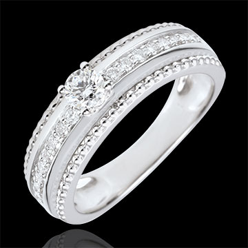 Ein umwerfender Solitär wird von zwei Reihen edler Goldperlen getragen, die in ihrer Mitte einen erlesenen Diamantring führen. Dieser Ring strahlt vor Eleganz und Weiblichkeit. Zentrierter Diamant: 0.18 kt. 19 Diamanten : 0.38 Karat - Weißgold (375/-): 3.4 g. Weitere Abmessungen