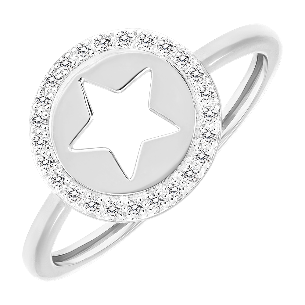 Der Stellar-Ring zeigt einen hohlen Stern aus Weißgold in der Mitte, umgeben von funkelnden Diamanten.…