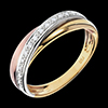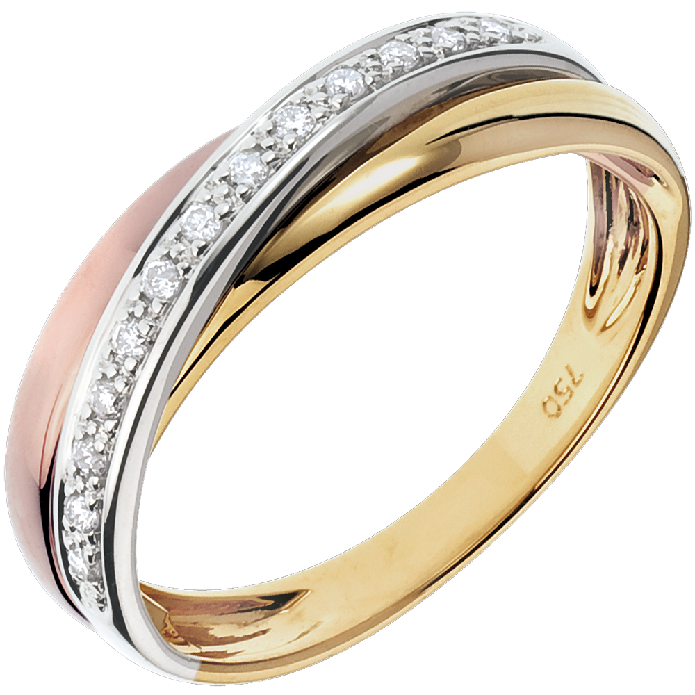 Die Besonderheit dieses Traurings rührt aus der harmonischen Verbindung von dreierlei Goldfarben, die von einem diamantbestetzten Band in Weißgold durchquert werden. 13 Diamanten : 0.1 Karat - Tricolor (750/-): 3.5 g. Weitere Abmessungen