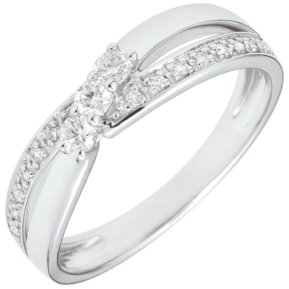 Eine von einer Goldwelle getragene Diamnttrilogie kreuzt eine Diamantkrümmung. 19 Diamanten : 0.18 Karat - Weißgold (750/-): 2.1 g. Weitere Abmessungen