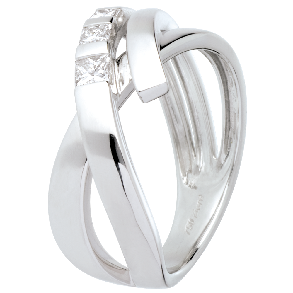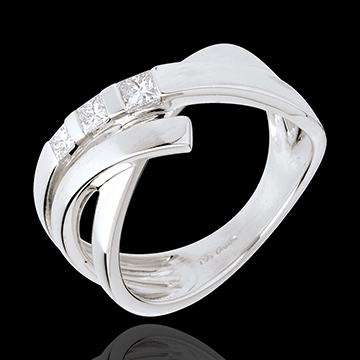 Wie eine Kordel besetzt mit drei funkelnden Diamanten umschlingt dieser schöne Ring den Finger. Elegant und zeitgenössisch. 3 Diamanten : 0.26 Karat - Weißgold (750/-): 4.9 g. Weitere Abmessungen