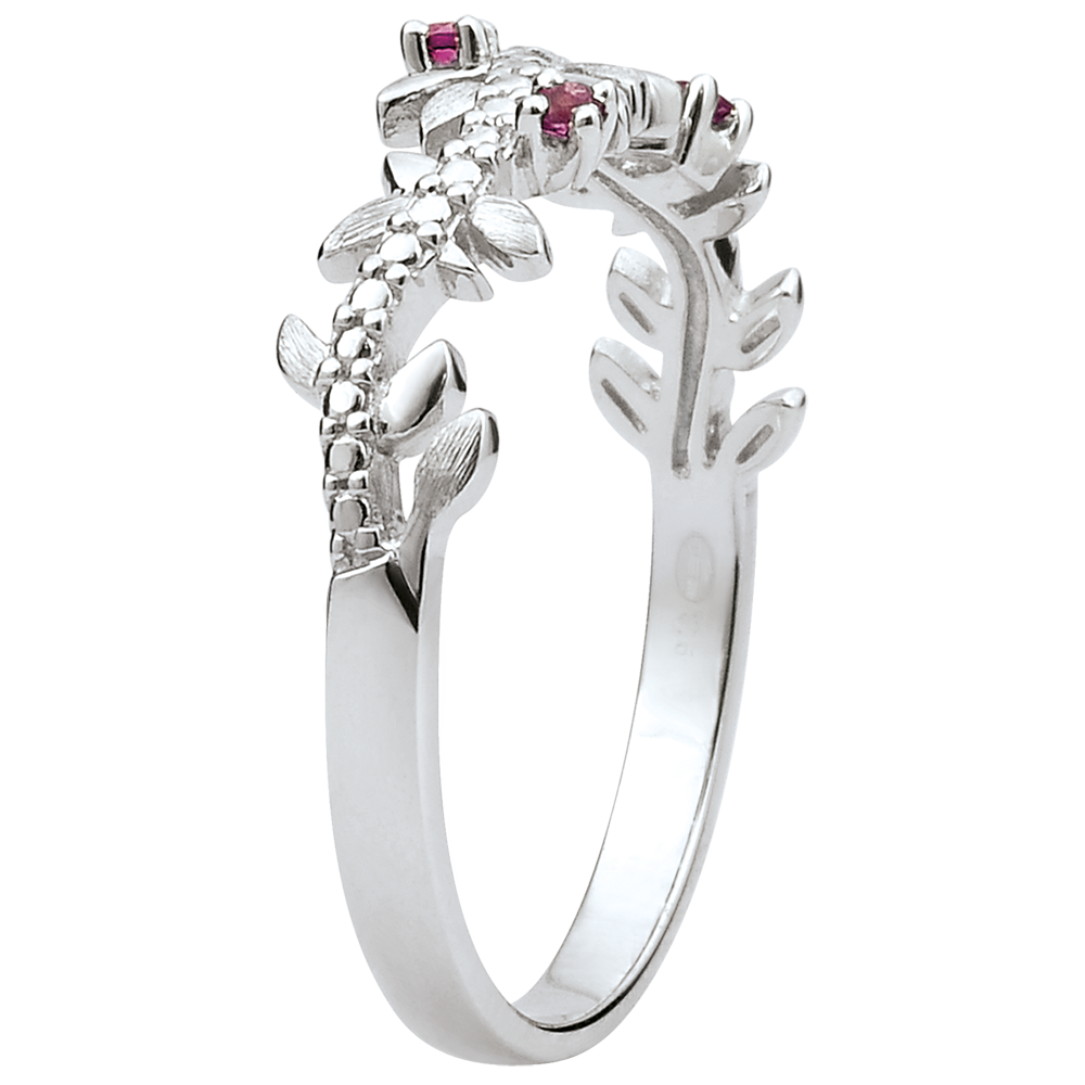Ein romantisches Zusammenspiel aus glänzendem und eismattem Weißgold, welche sich in den verschiedenen Blattformen dieses mit Rhodoliten und Diamanten besetzten Ringes wiederfinden.
