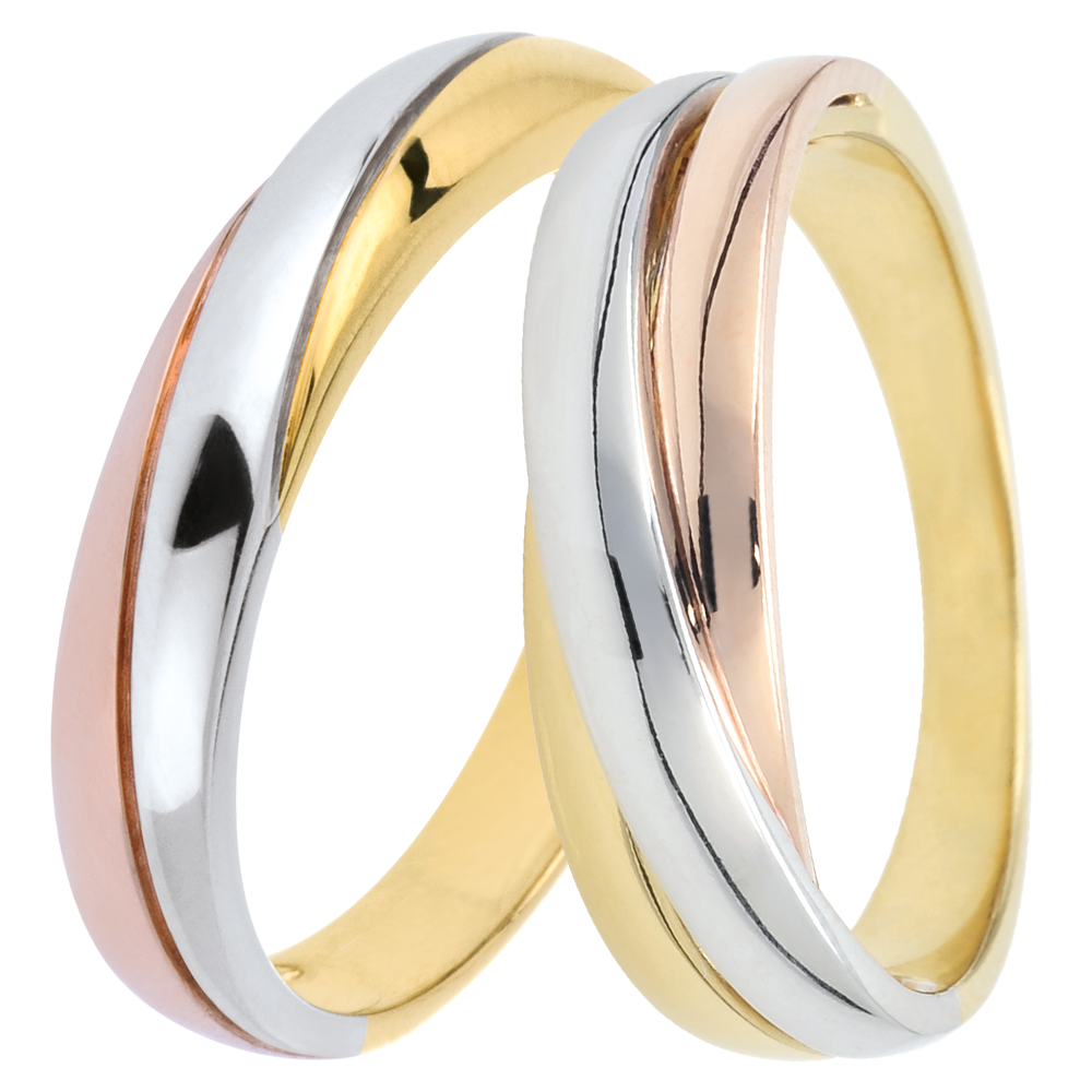 Ein Zusammenspiel aus dreierlei Goldfarben, die zu einem feinen Trauring zusammenfließen.