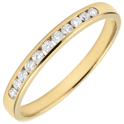 Dieser Trauring verkörpert das perfekte Zusammenspiel eines gelbgoldenen Ringes, welcher mit elf rundgeschliffenen Diamanten in Kanalfassung besetzt ist. Dieses Schmuckstück steht symbolisch für ein außergewöhnliche und beständige Verbindung. 11 Diamanten : 0.15 Karat - Gelbgold (750/-): 1.7 g. Weitere Abmessungen